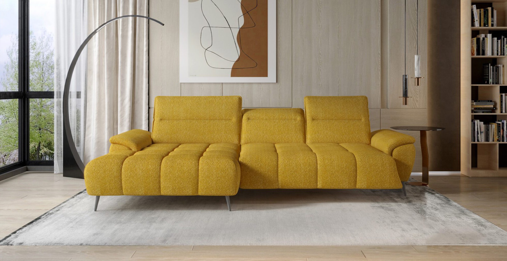 Stylowe pikowane siedzisko i wysokie metalowe nóżki nadają narożnikowi lekko loftowy, a jednocześnie nowoczesny charakter.
