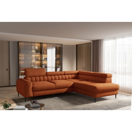 Dzięki regulowanym zagłówkom i sprężystemu, miękkiemu siedzisku narożnik zapewnia idealne warunki do relaksu, a funkcja spania i pojemnik na pościel dodatkowo zwiększają jego praktyczność.
