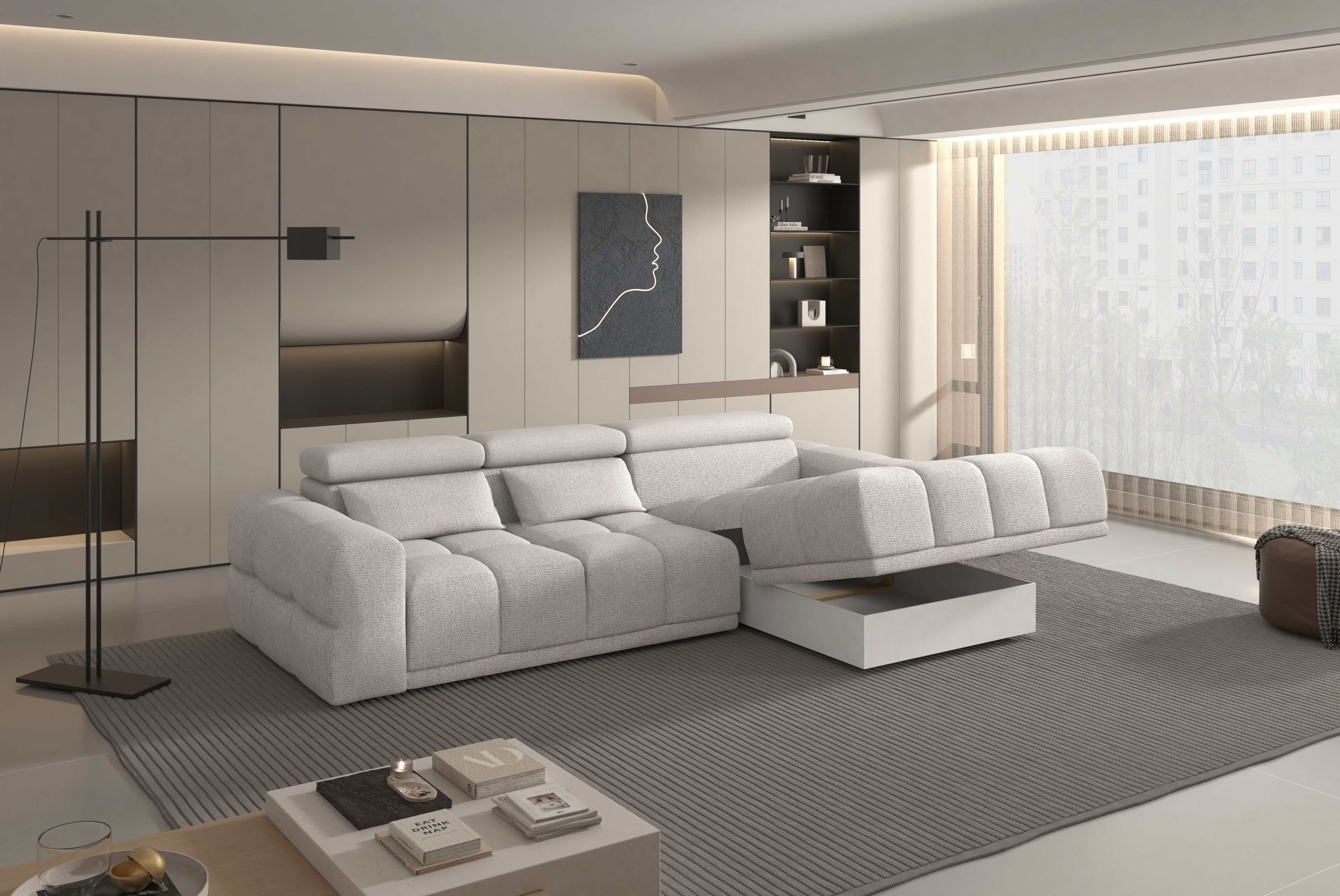 Wyposażony w elektrycznie rozkładaną funkcję spania, narożnik PANAMA BOX umożliwia wygodny odpoczynek zarówno w ciągu dnia, jak i w nocy.