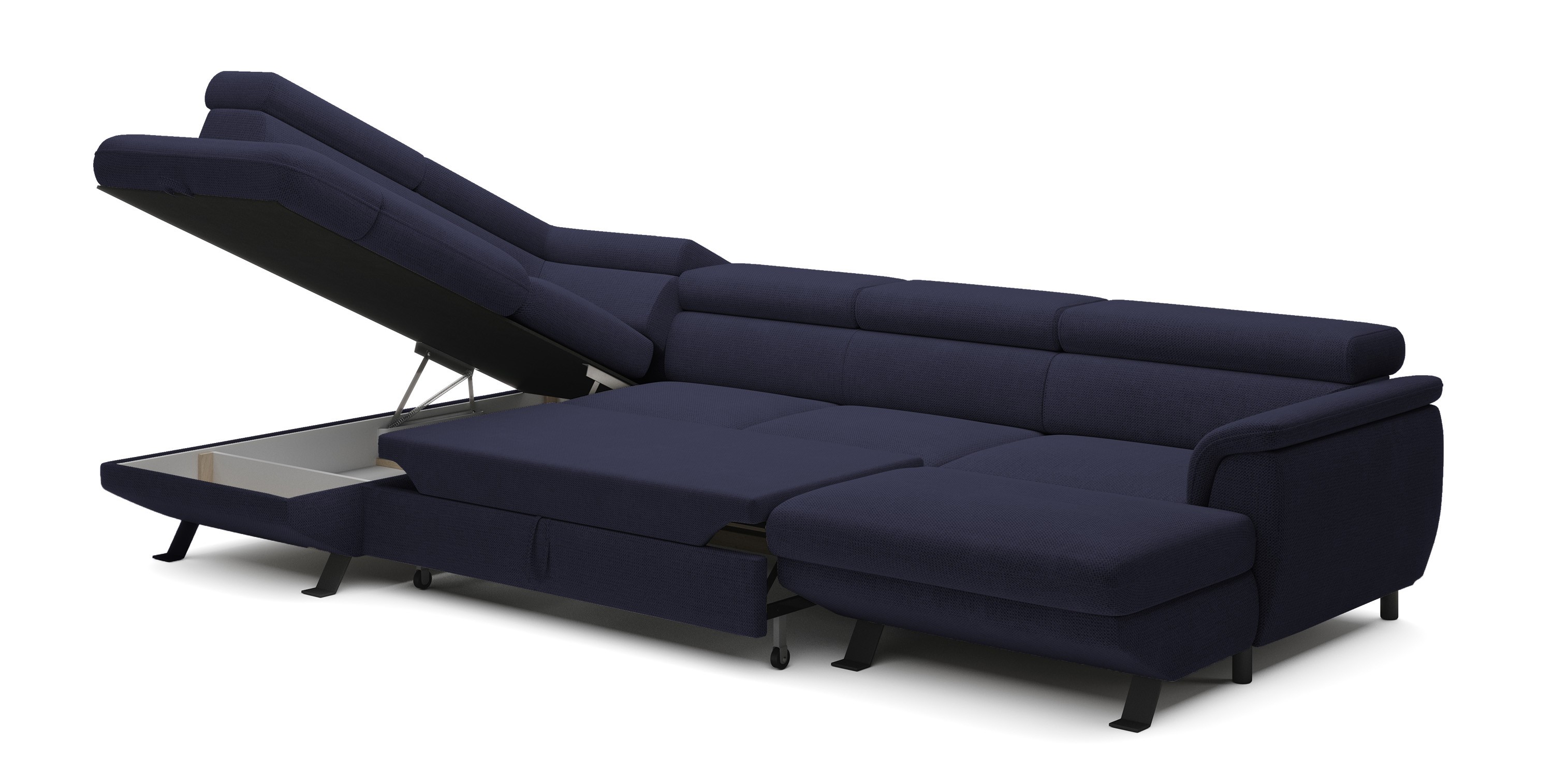 Solidny stelaż z drewna oraz płyty wiórowej zapewnia stabilność i trwałość konstrukcji, a możliwość wyboru narożnika prawego lub lewego pozwala idealnie dopasować mebel do układu wnętrza.