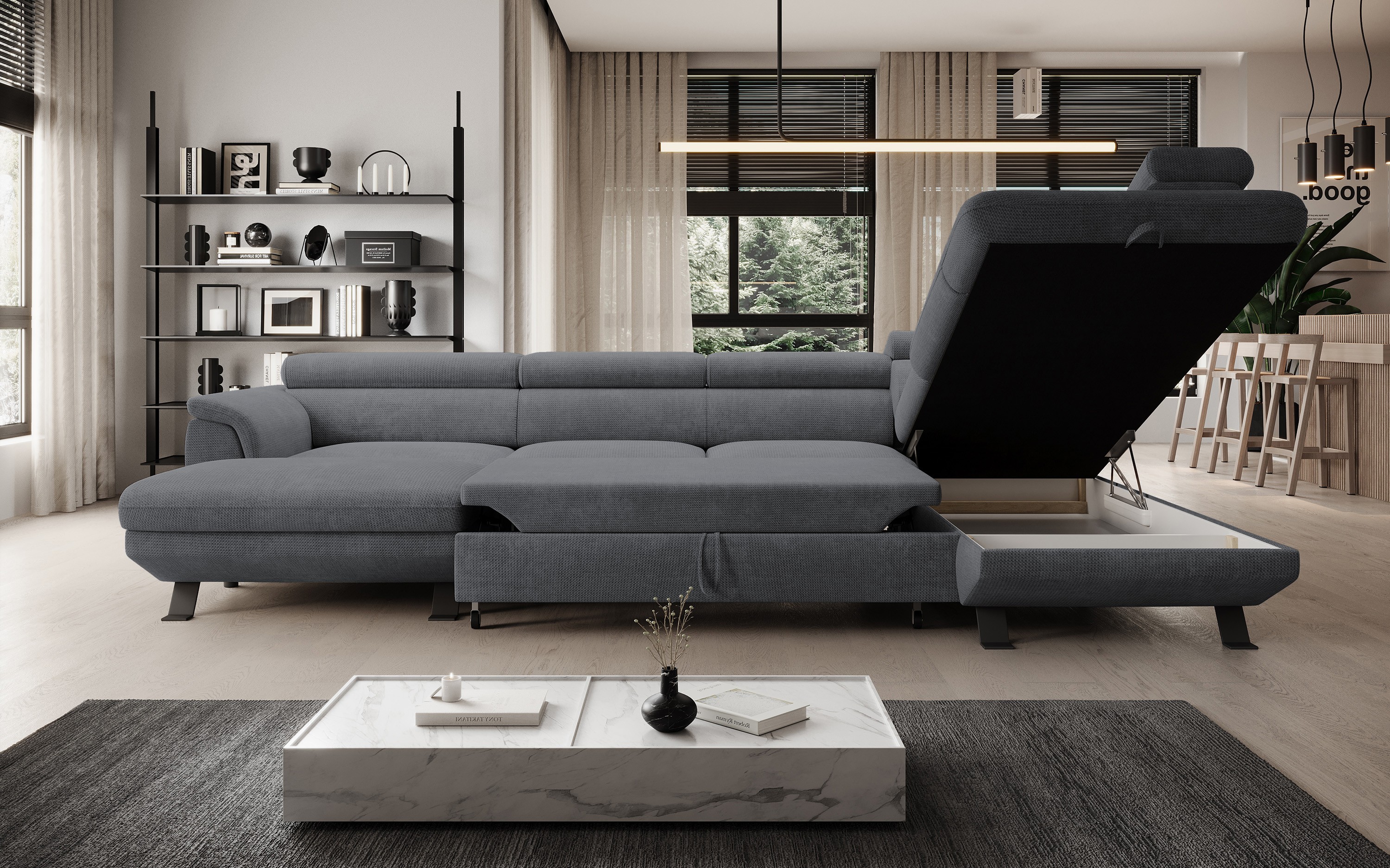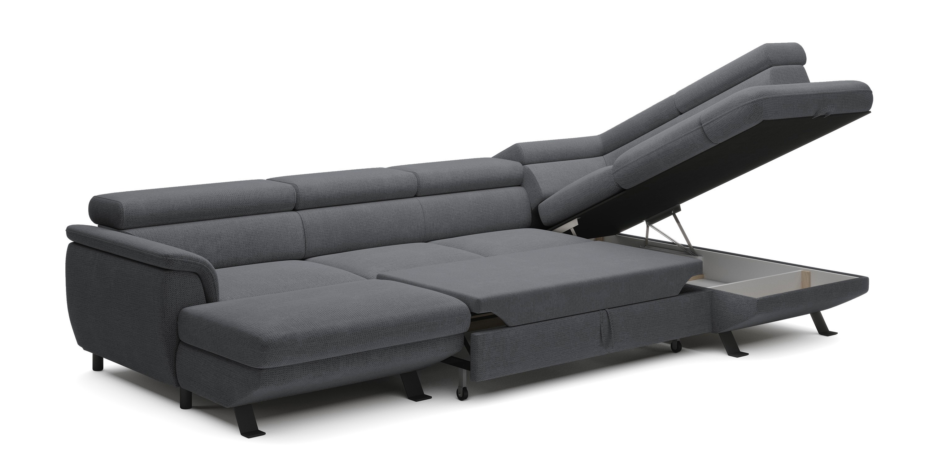 Solidny stelaż z drewna oraz płyty wiórowej zapewnia stabilność i trwałość konstrukcji, a możliwość wyboru narożnika prawego lub lewego pozwala idealnie dopasować mebel do układu wnętrza.