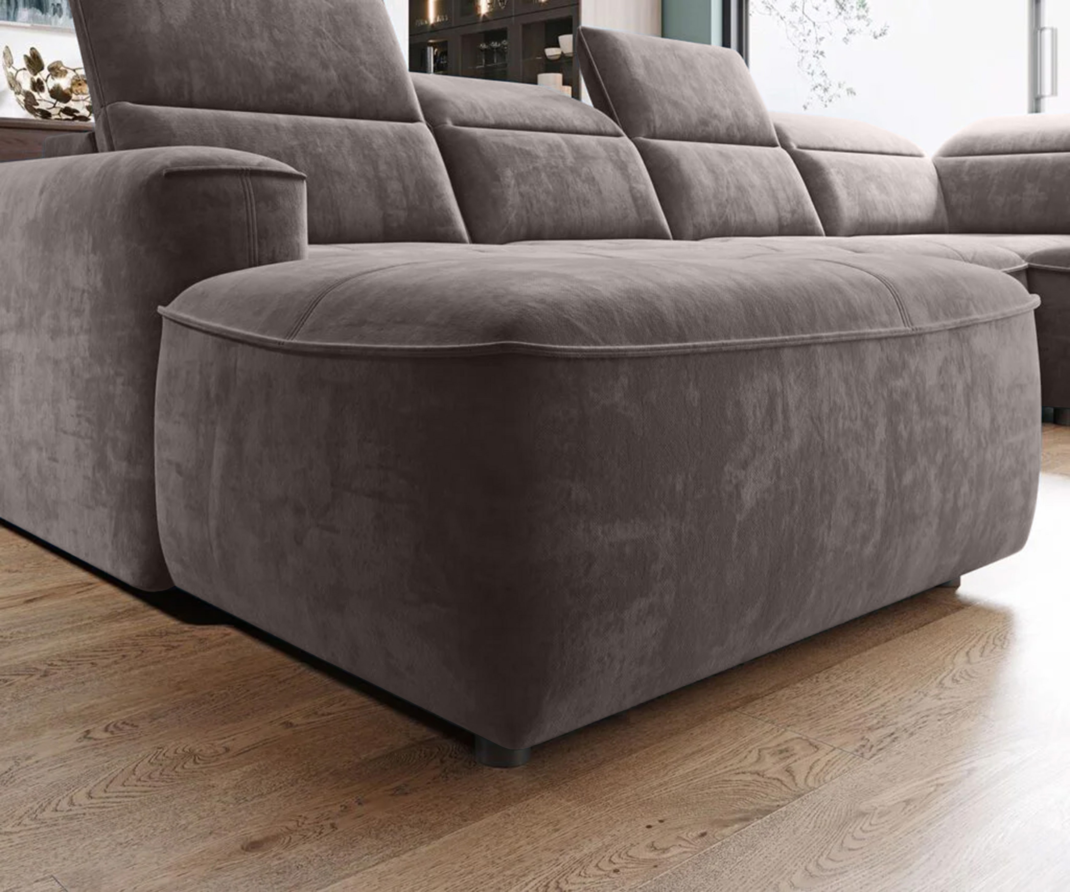 Subtelne pikowania podkreślają nowoczesny charakter, a regulowane zagłówki i elektryczna funkcja spania sprawiają, że narożnik doskonale sprawdza się na co dzień. Dzięki regulowanej głębokości siedziska z łatwością dopasujesz komfort wypoczynku do swoich potrzeb.