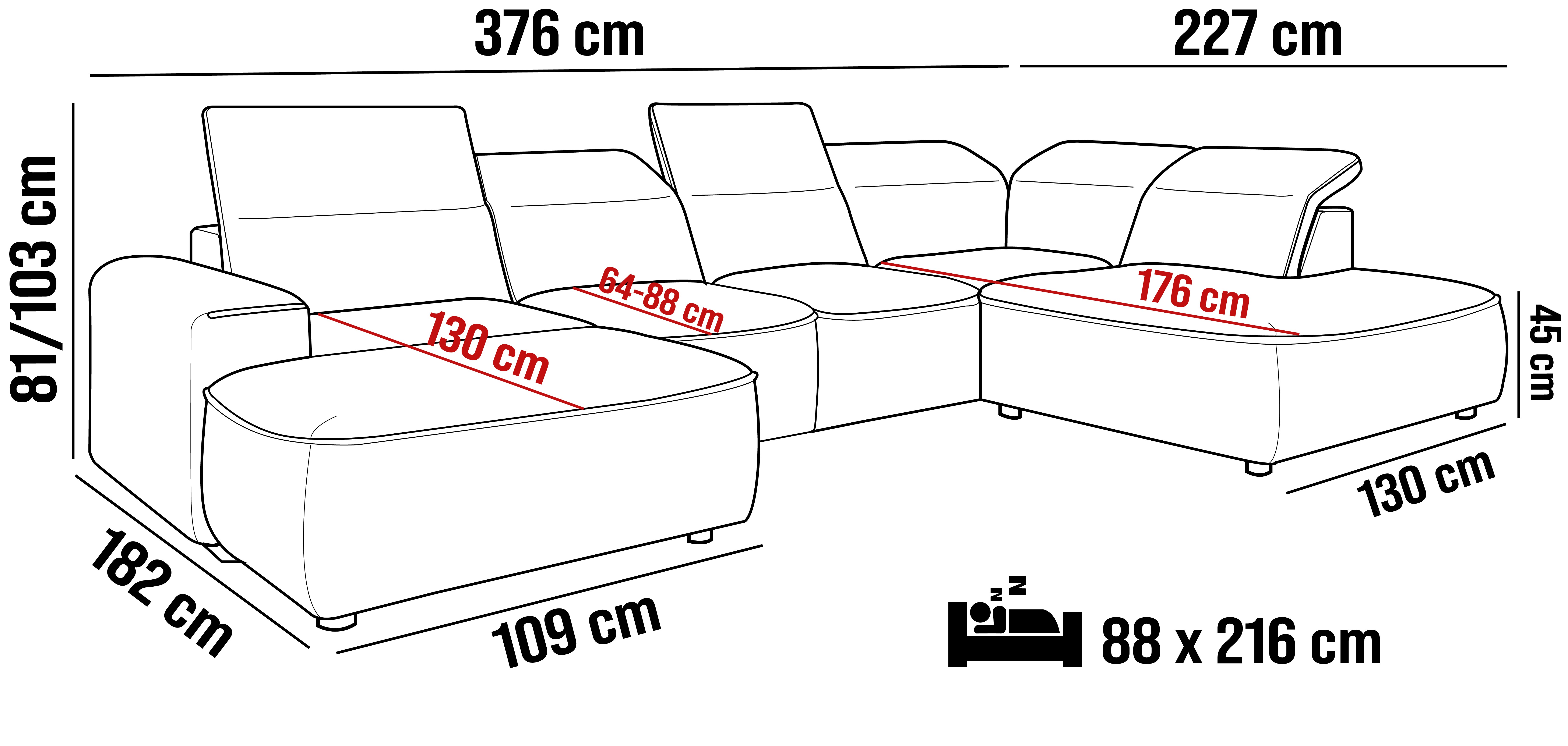 Subtelne pikowania podkreślają nowoczesny charakter, a regulowane zagłówki i elektryczna funkcja spania sprawiają, że narożnik doskonale sprawdza się na co dzień. Dzięki regulowanej głębokości siedziska z łatwością dopasujesz komfort wypoczynku do swoich potrzeb.