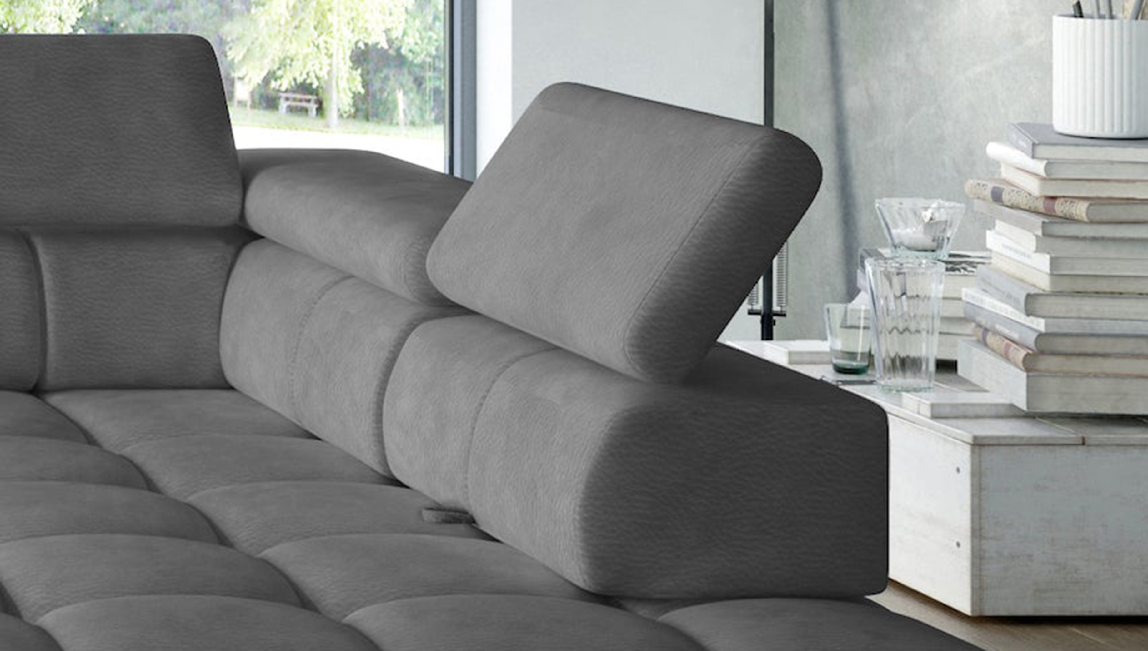 Dodatkowo narożnik wyposażony jest w przesuwne oparcie oraz 6 regulowanych zagłówków z możliwością blokady w dowolnej pozycji.