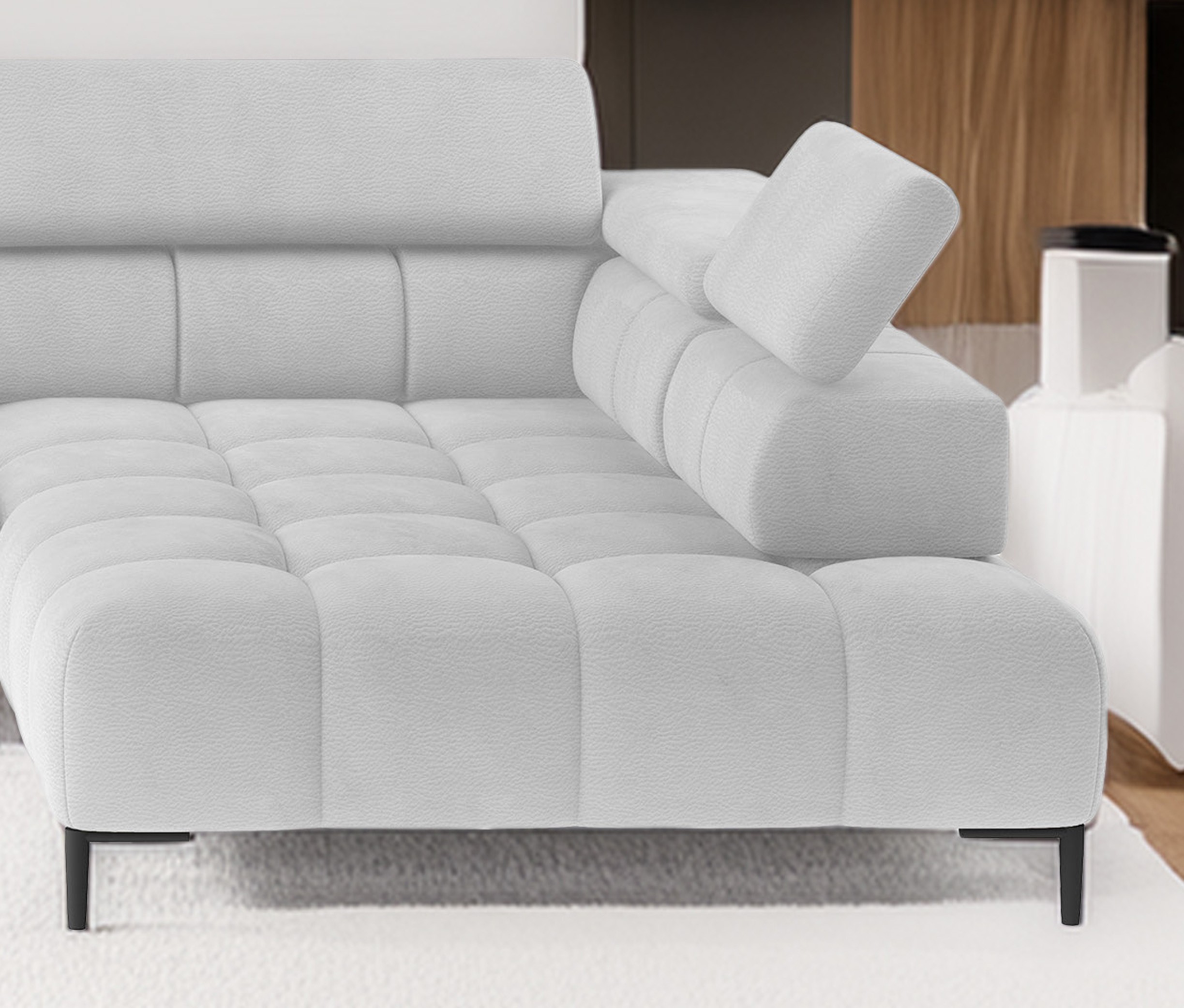 Dodatkowo narożnik wyposażony jest w przesuwne oparcie oraz 6 regulowanych zagłówków z możliwością blokady w dowolnej pozycji.