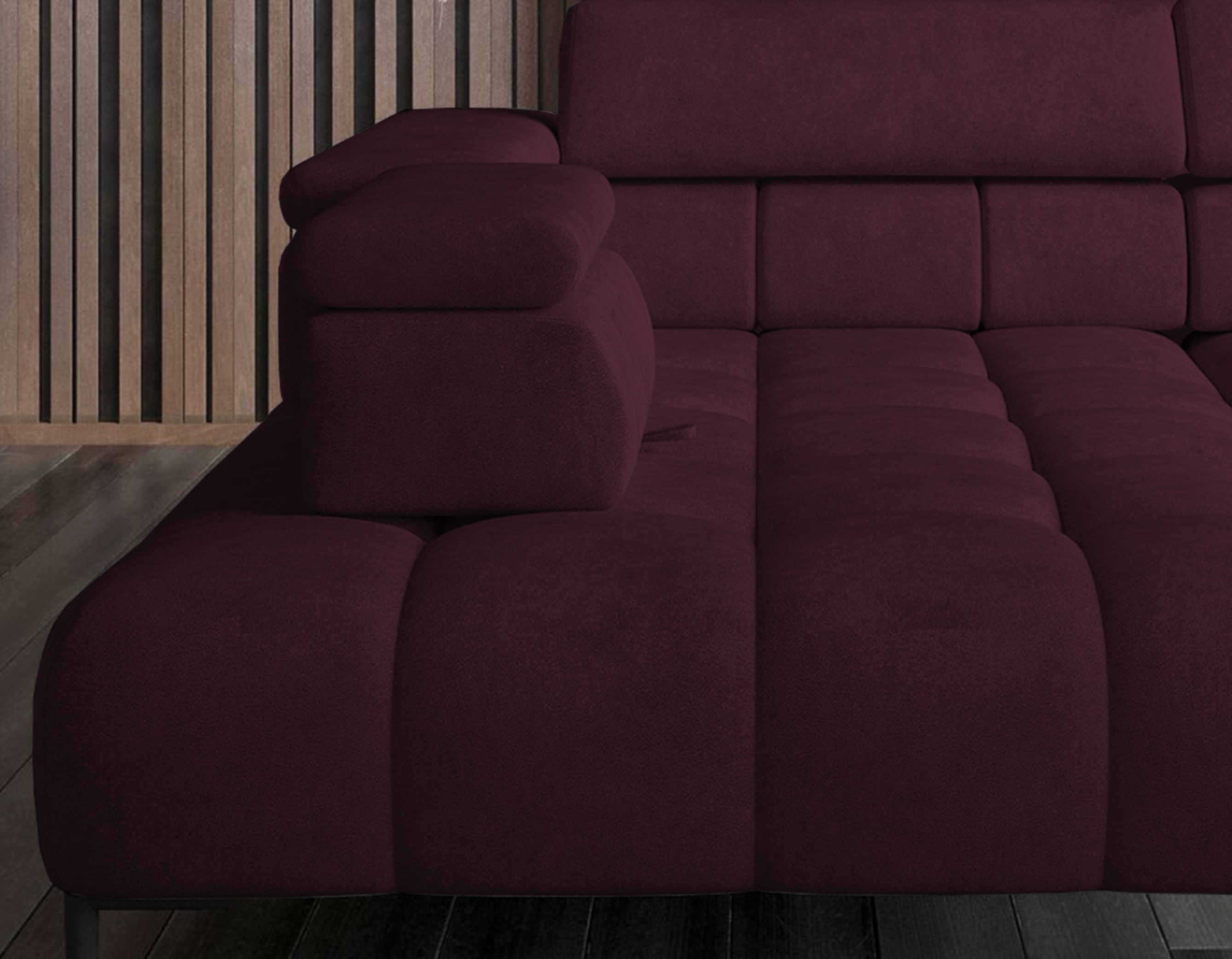 Dodatkowo narożnik wyposażony jest w przesuwne oparcie oraz 6 regulowanych zagłówków z możliwością blokady w dowolnej pozycji.