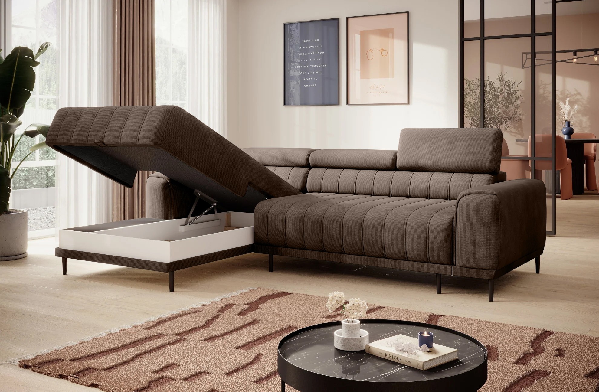 Pikowane siedzisko nadaje narożnikowi nowoczesnego charakteru, a wysokie metalowe nóżki w stylu loftowym dodają mu lekkości i elegancji.