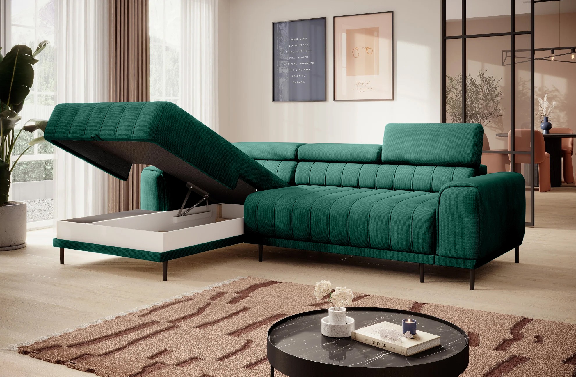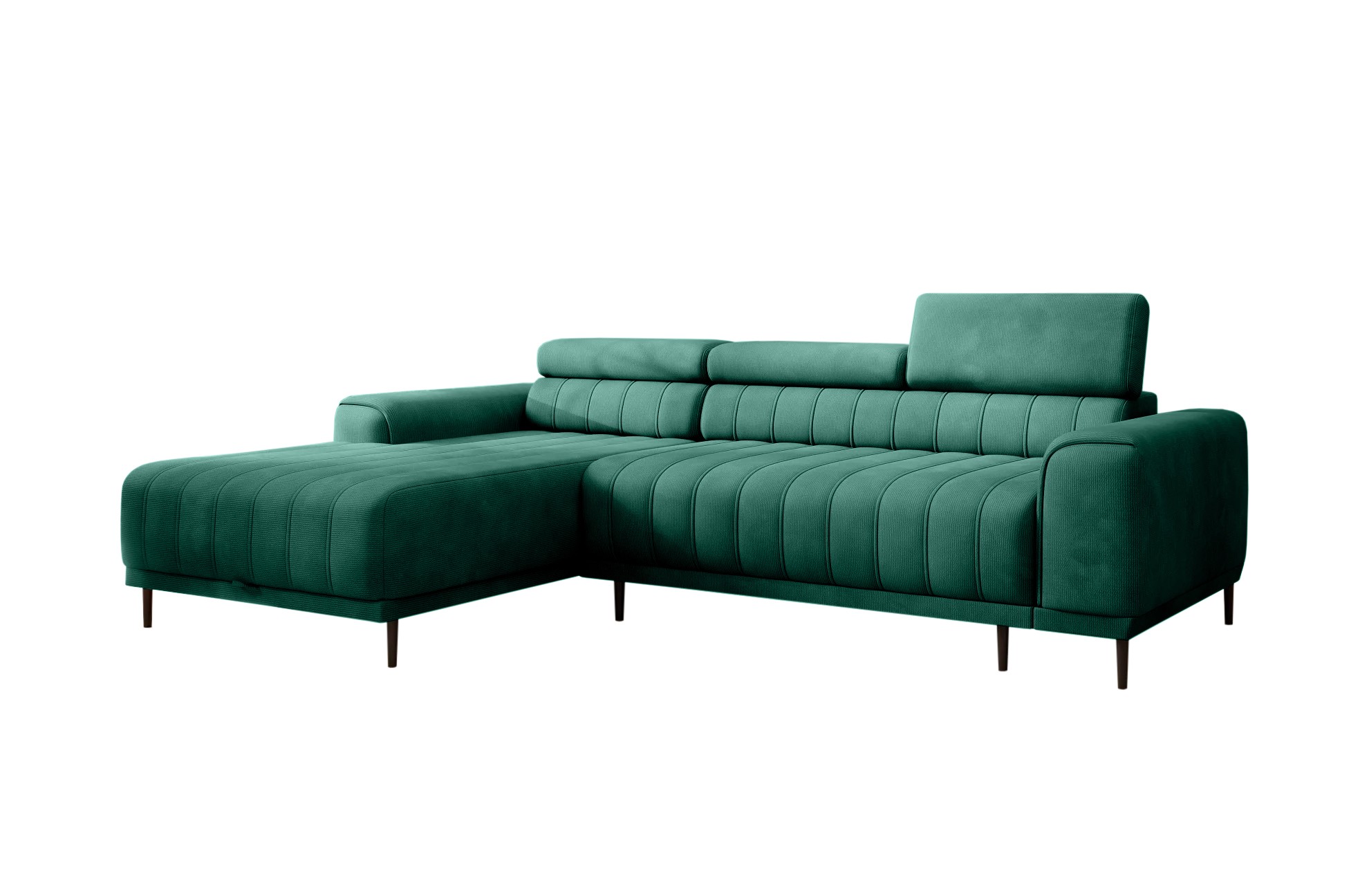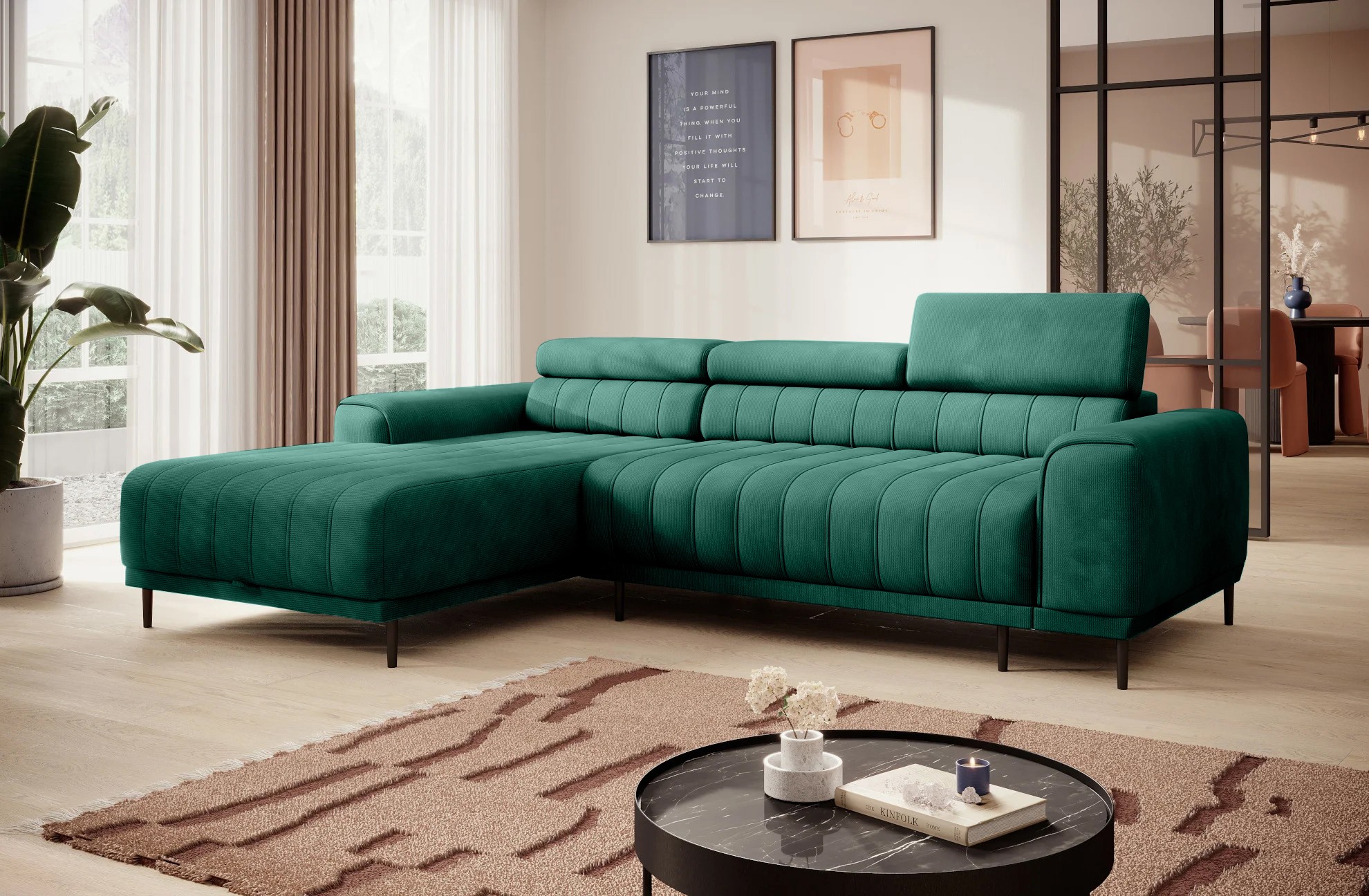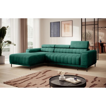 Pikowane siedzisko nadaje narożnikowi nowoczesnego charakteru, a wysokie metalowe nóżki w stylu loftowym dodają mu lekkości i elegancji.
