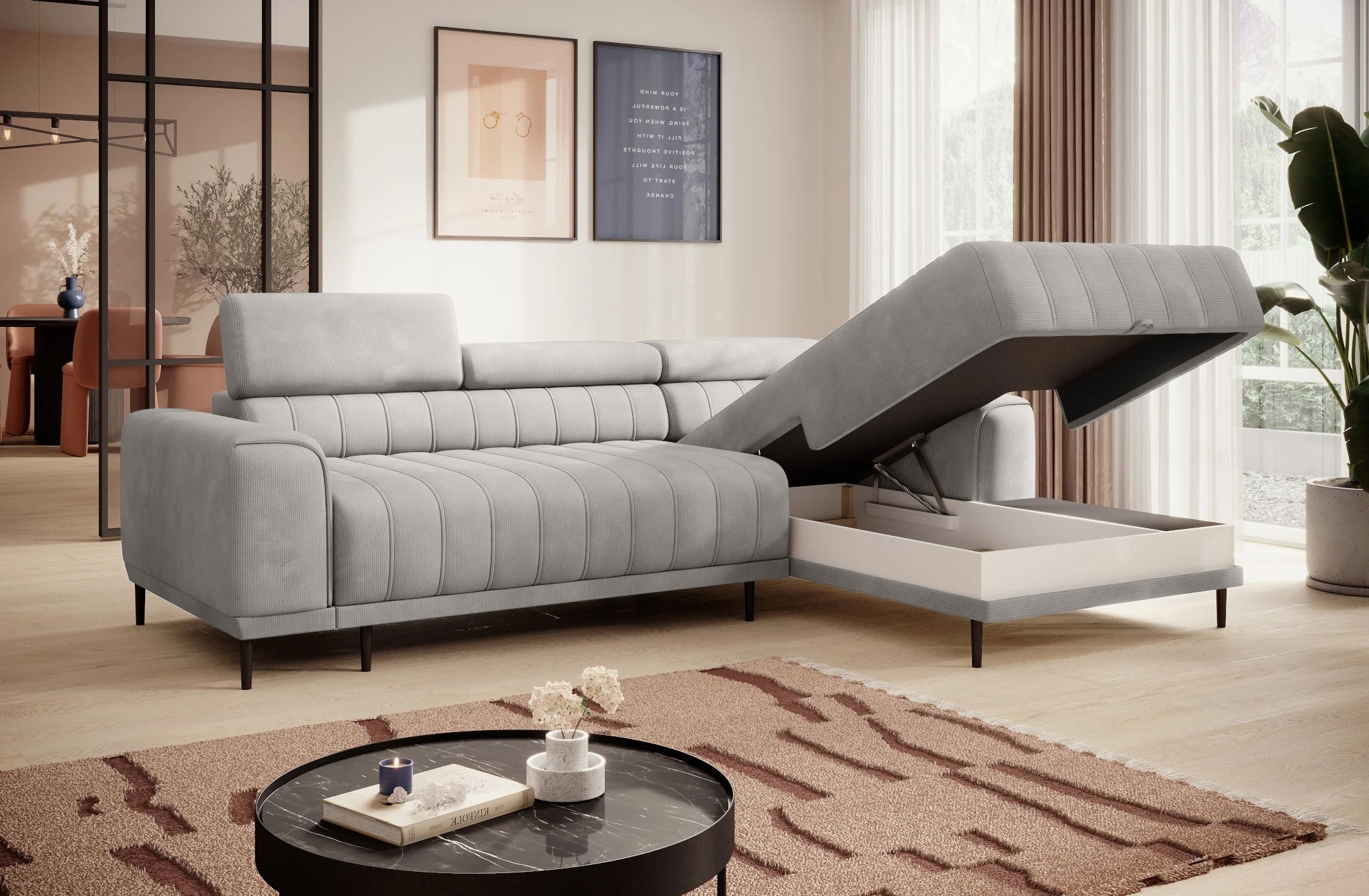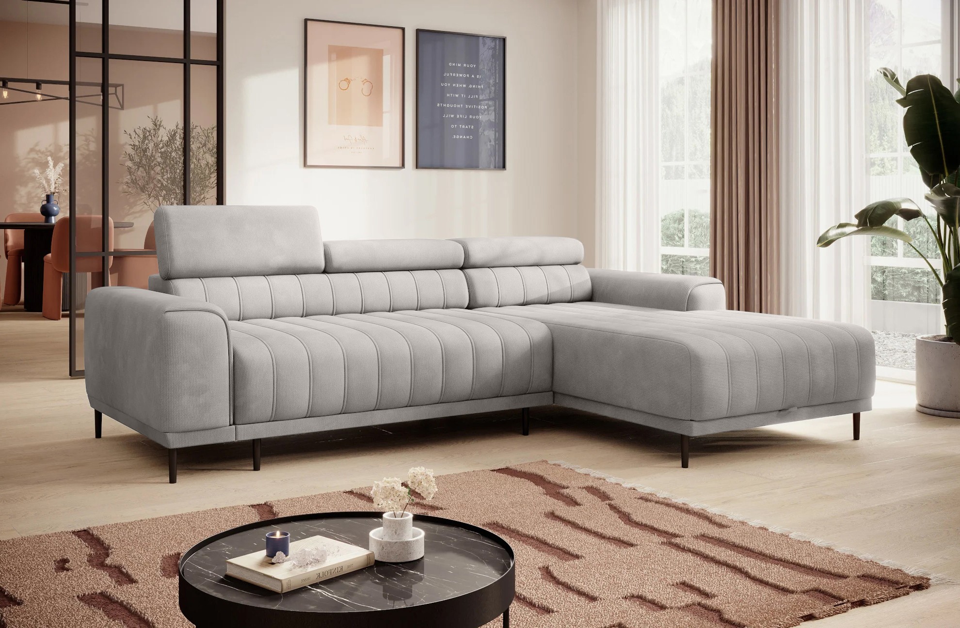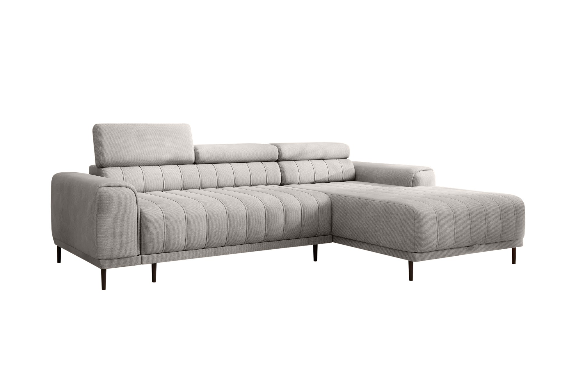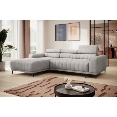 Pikowane siedzisko nadaje narożnikowi nowoczesnego charakteru, a wysokie metalowe nóżki w stylu loftowym dodają mu lekkości i elegancji.
