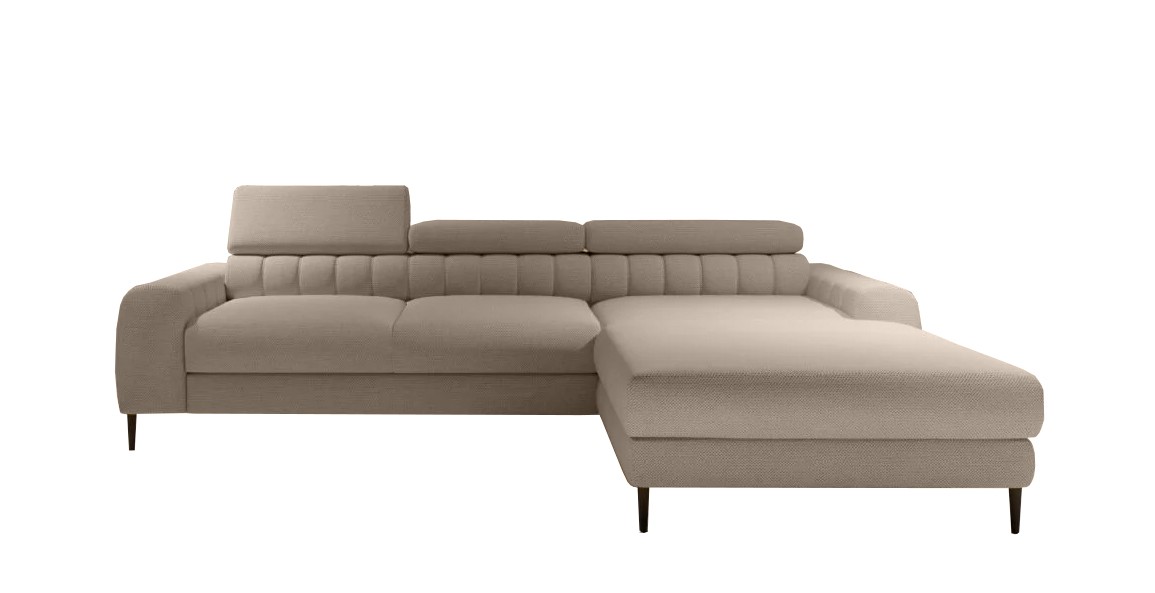 Dzięki regulowanym zagłówkom i sprężystemu, miękkiemu siedzisku narożnik zapewnia idealne warunki do relaksu, a funkcja spania i pojemnik na pościel dodatkowo zwiększają jego praktyczność.
