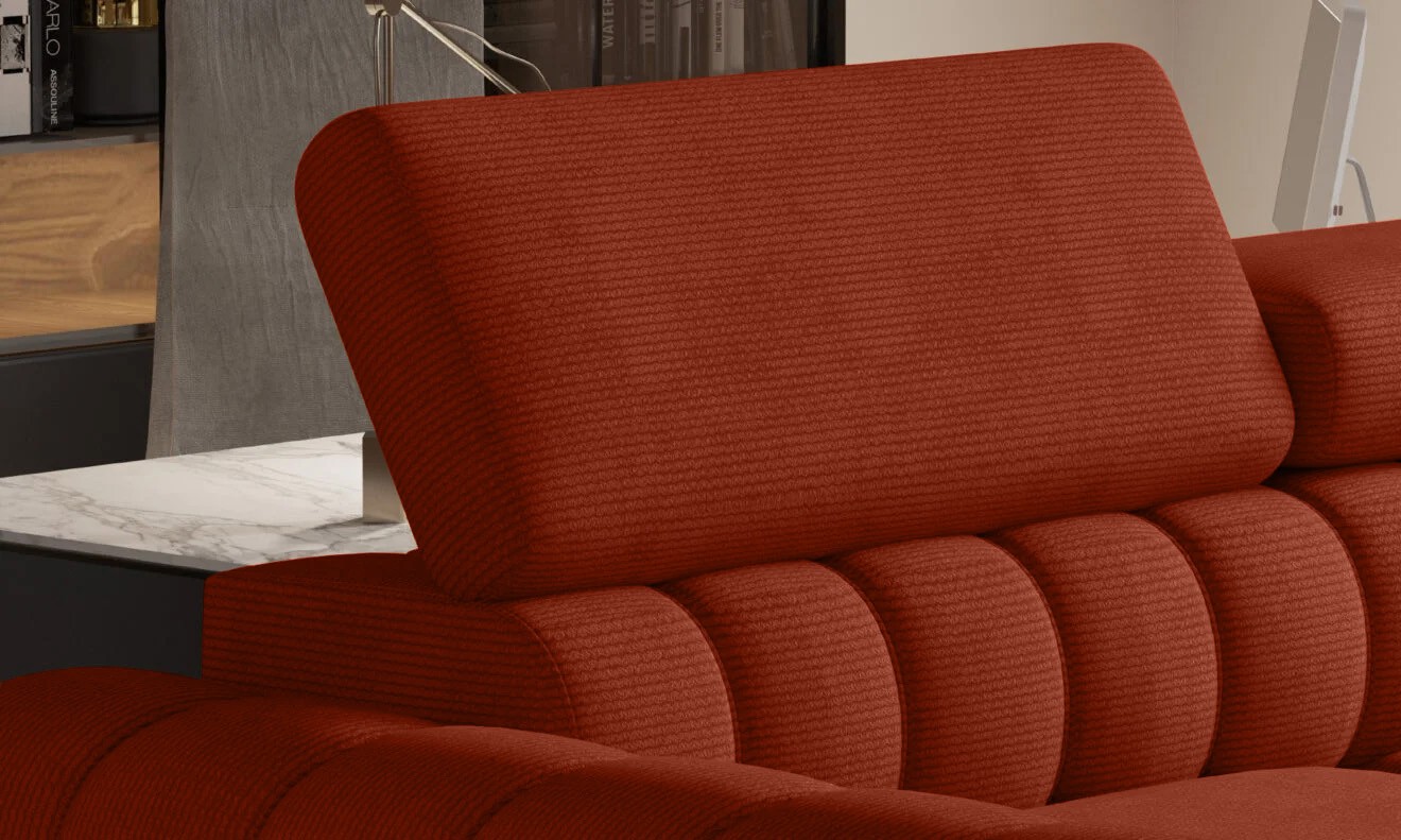 Dzięki regulowanym zagłówkom i sprężystemu, miękkiemu siedzisku narożnik zapewnia idealne warunki do relaksu, a funkcja spania i pojemnik na pościel dodatkowo zwiększają jego praktyczność.