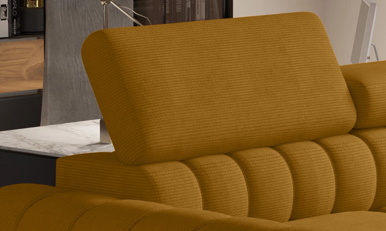 Dzięki regulowanym zagłówkom i sprężystemu, miękkiemu siedzisku narożnik zapewnia idealne warunki do relaksu, a funkcja spania i pojemnik na pościel dodatkowo zwiększają jego praktyczność.