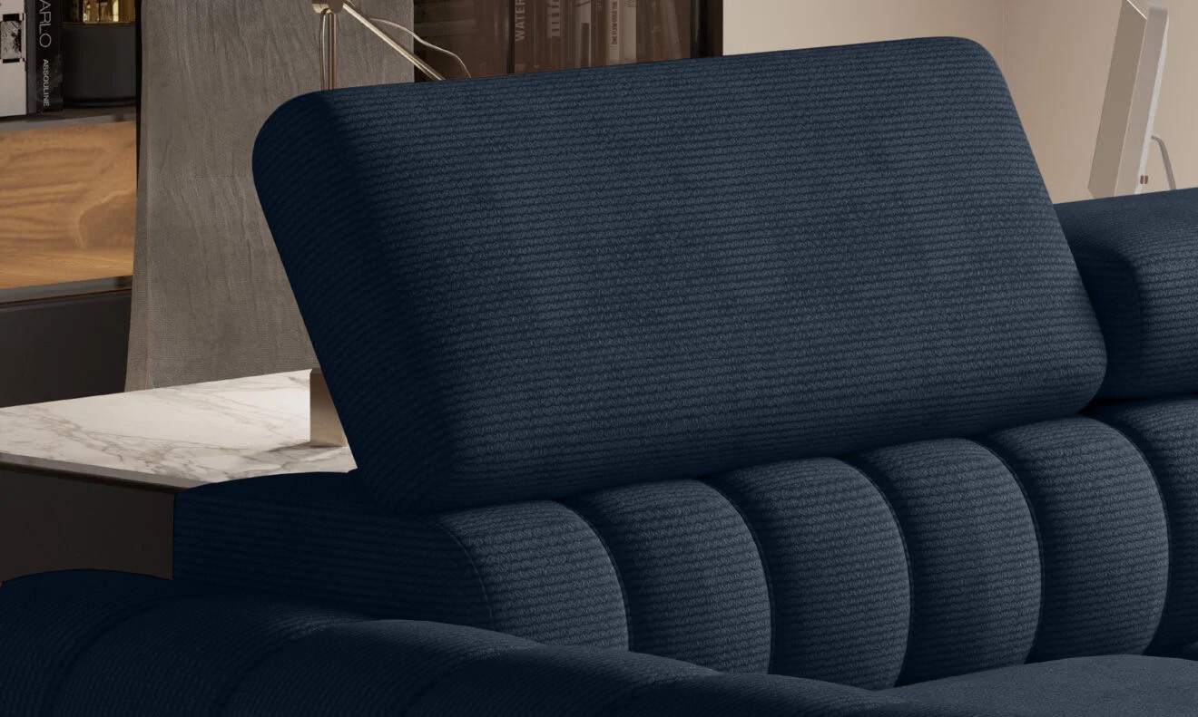 Dzięki regulowanym zagłówkom i sprężystemu, miękkiemu siedzisku narożnik zapewnia idealne warunki do relaksu, a funkcja spania i pojemnik na pościel dodatkowo zwiększają jego praktyczność.