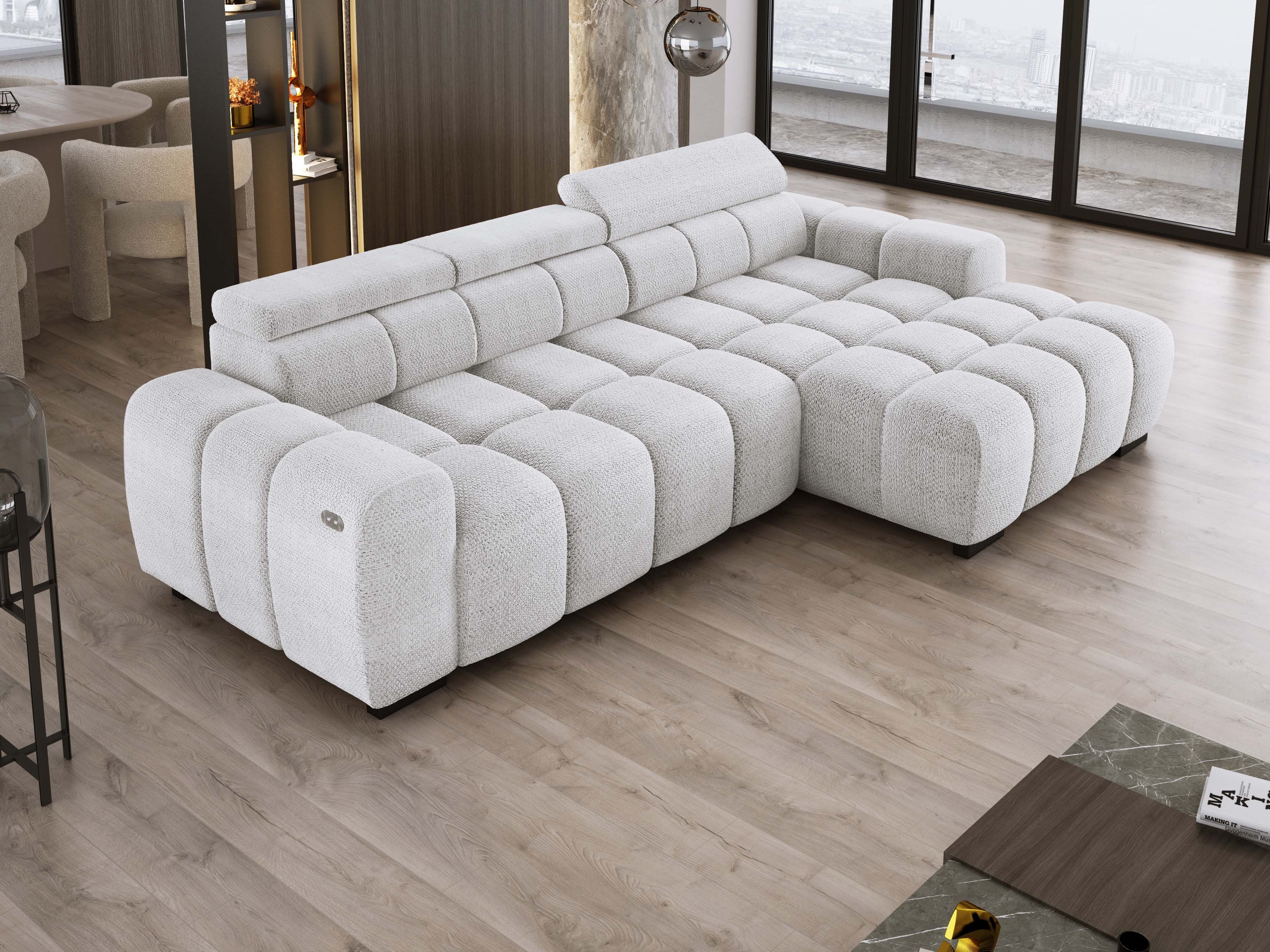 Wyposażony w elektrycznie wysuwane siedzisko (do 27 cm), BULL oferuje wygodną przestrzeń do wypoczynku oraz praktyczną funkcję spania na co dzień. Regulowane zagłówki pozwalają dostosować pozycję do własnych preferencji, zapewniając wygodę podczas relaksu. Dzięki solidnej konstrukcji i wysokiej jakości materiałom narożnik BULL to idealne połączenie komfortu i funkcjonalności.