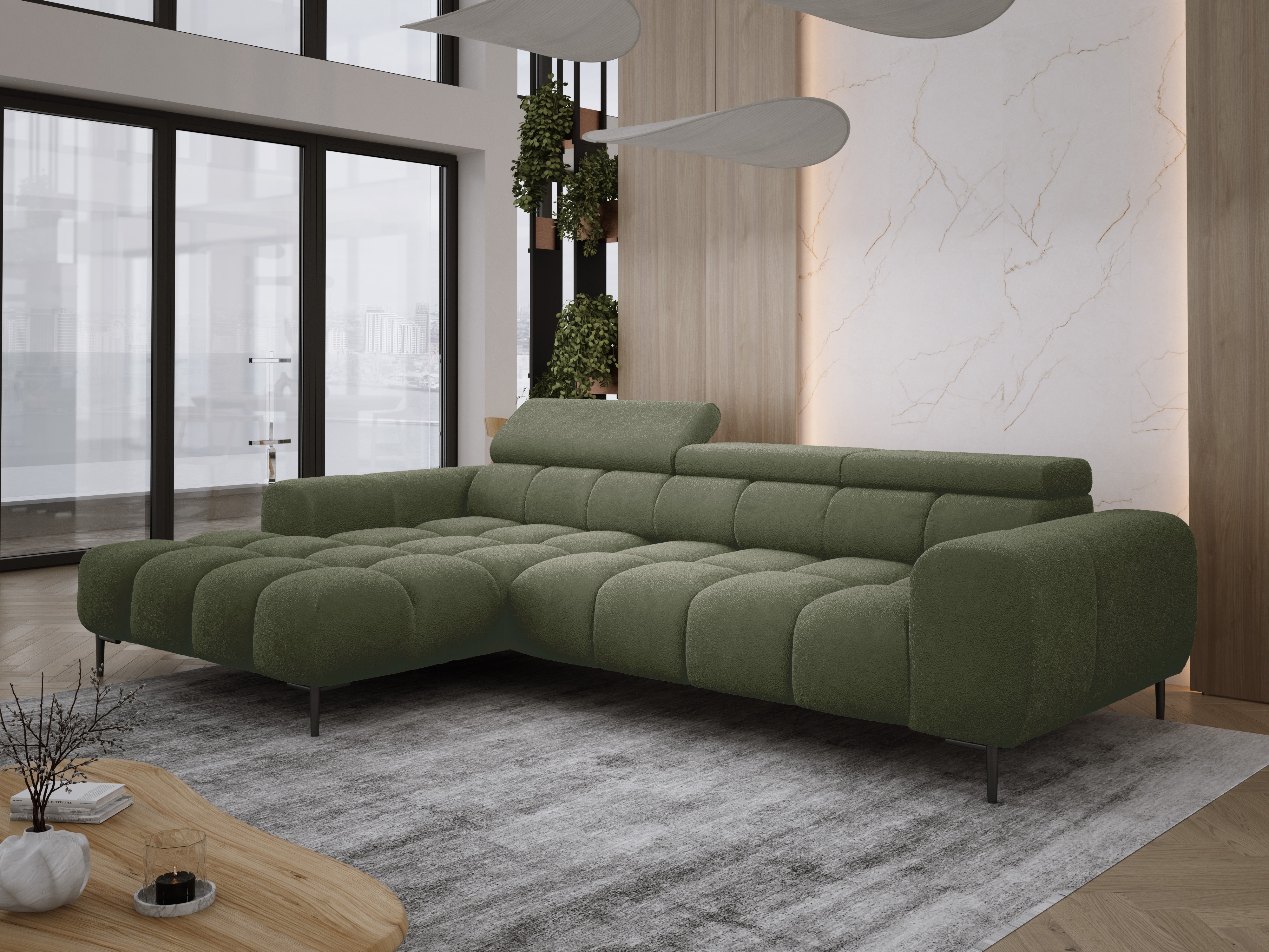 Pikowane siedzisko nadaje narożnikowi nowoczesnego charakteru, a wysokie metalowe nóżki (czarne lub złote) w stylu loftowym dodają mu lekkości i elegancji.