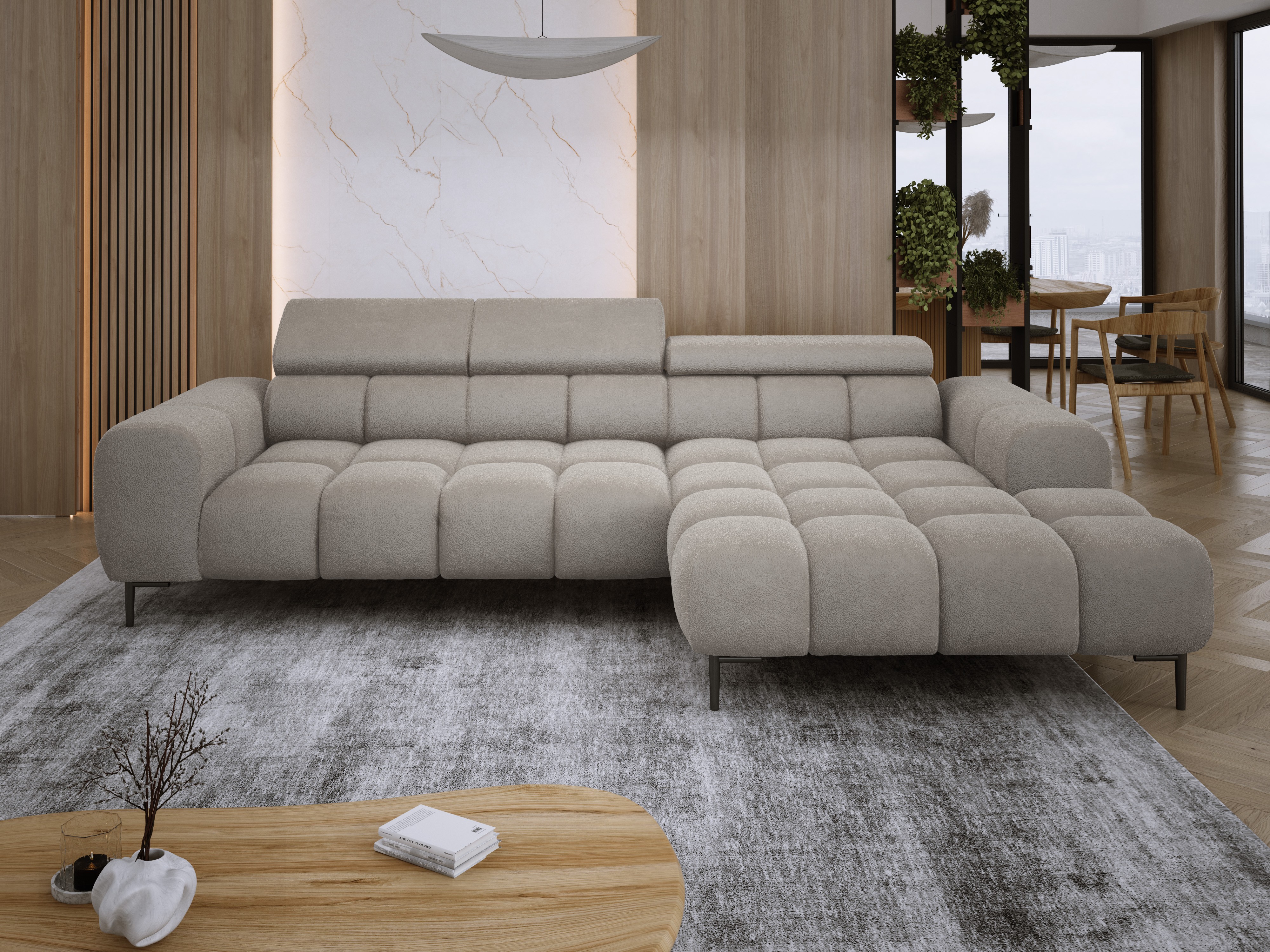 Pikowane siedzisko nadaje narożnikowi nowoczesnego charakteru, a wysokie metalowe nóżki (czarne lub złote) w stylu loftowym dodają mu lekkości i elegancji.