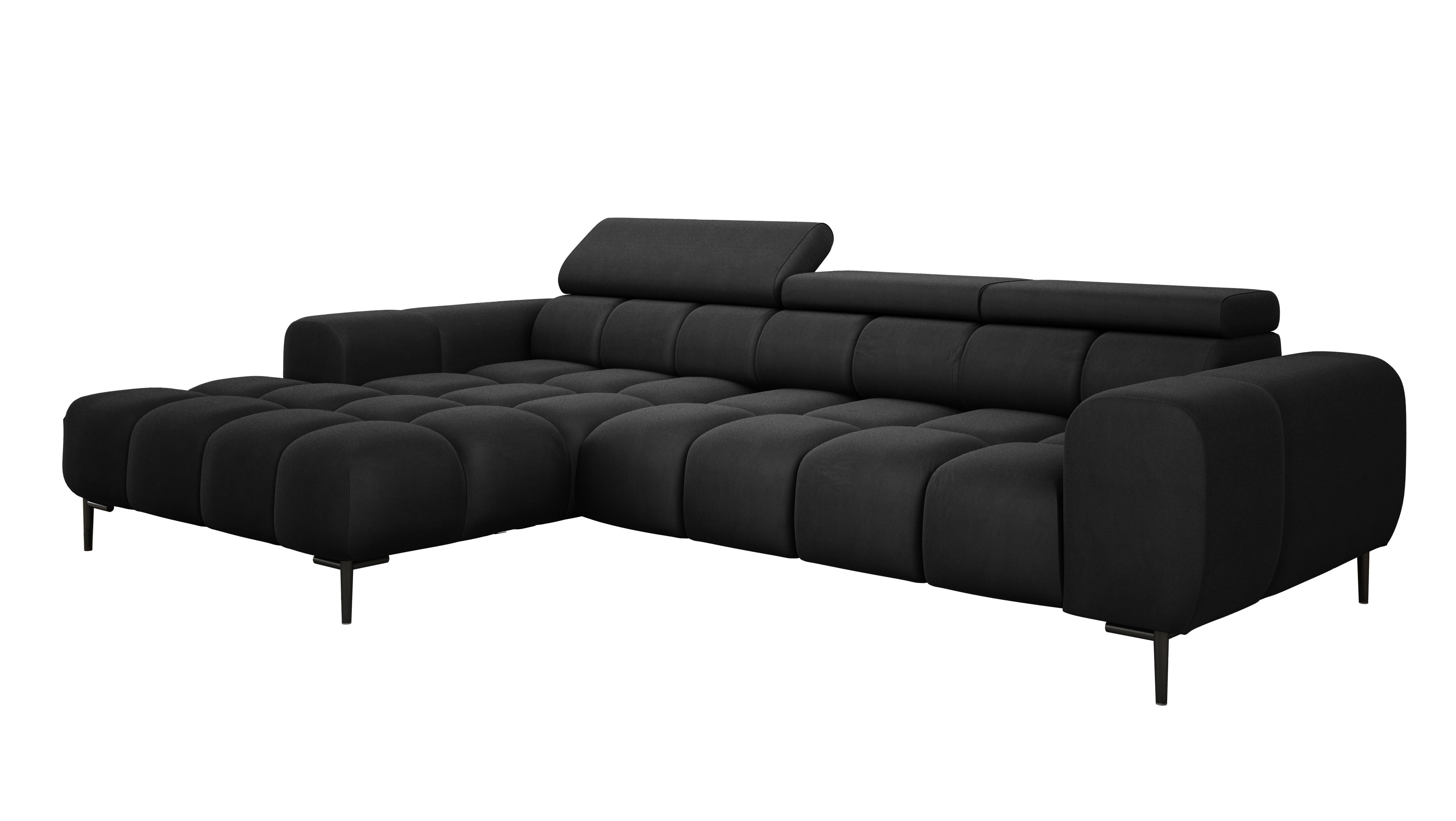 Pikowane siedzisko nadaje narożnikowi nowoczesnego charakteru, a wysokie metalowe nóżki (czarne lub złote) w stylu loftowym dodają mu lekkości i elegancji.