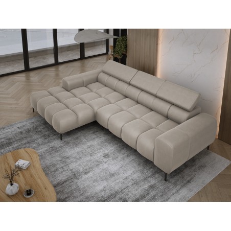 Pikowane siedzisko nadaje narożnikowi nowoczesnego charakteru, a wysokie metalowe nóżki (czarne lub złote) w stylu loftowym dodają mu lekkości i elegancji.
