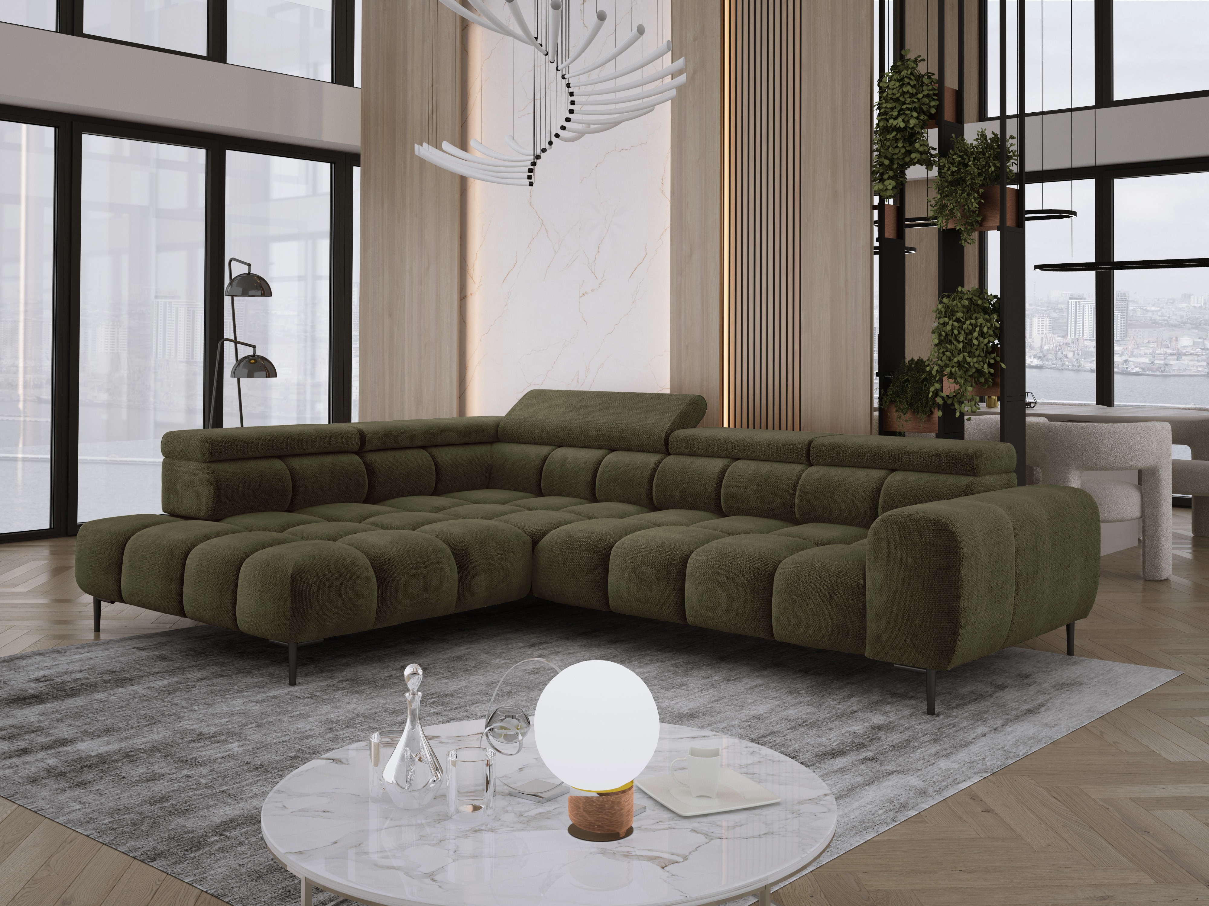 Stylowe pikowane siedzisko i wysokie metalowe nóżki (dostępne w kolorze czarnym lub złotym) nadają narożnikowi lekko loftowy, a jednocześnie nowoczesny charakter.