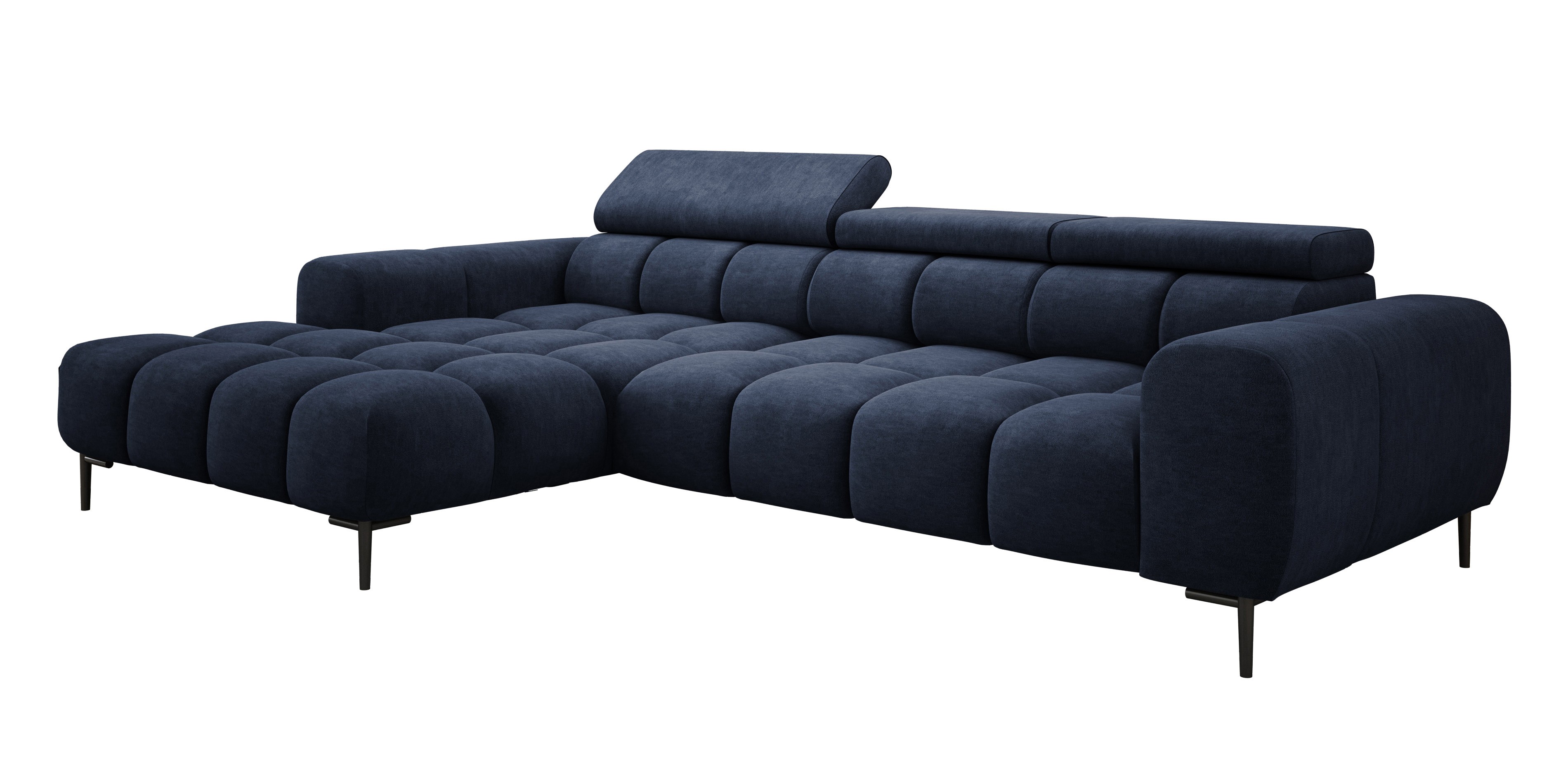 Pikowane siedzisko nadaje narożnikowi nowoczesnego charakteru, a wysokie metalowe nóżki (czarne lub złote) w stylu loftowym dodają mu lekkości i elegancji.