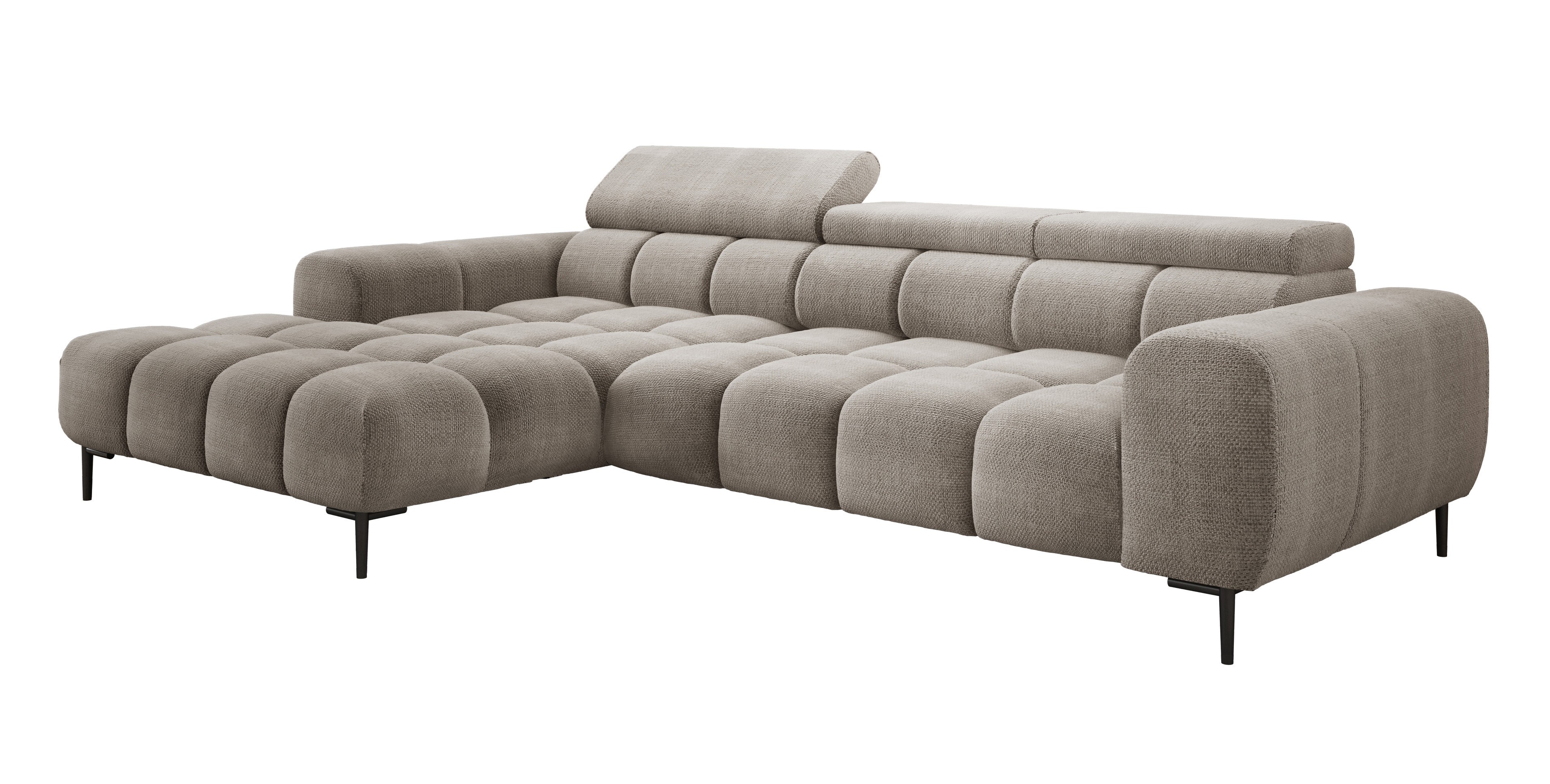 Pikowane siedzisko nadaje narożnikowi nowoczesnego charakteru, a wysokie metalowe nóżki (czarne lub złote) w stylu loftowym dodają mu lekkości i elegancji.