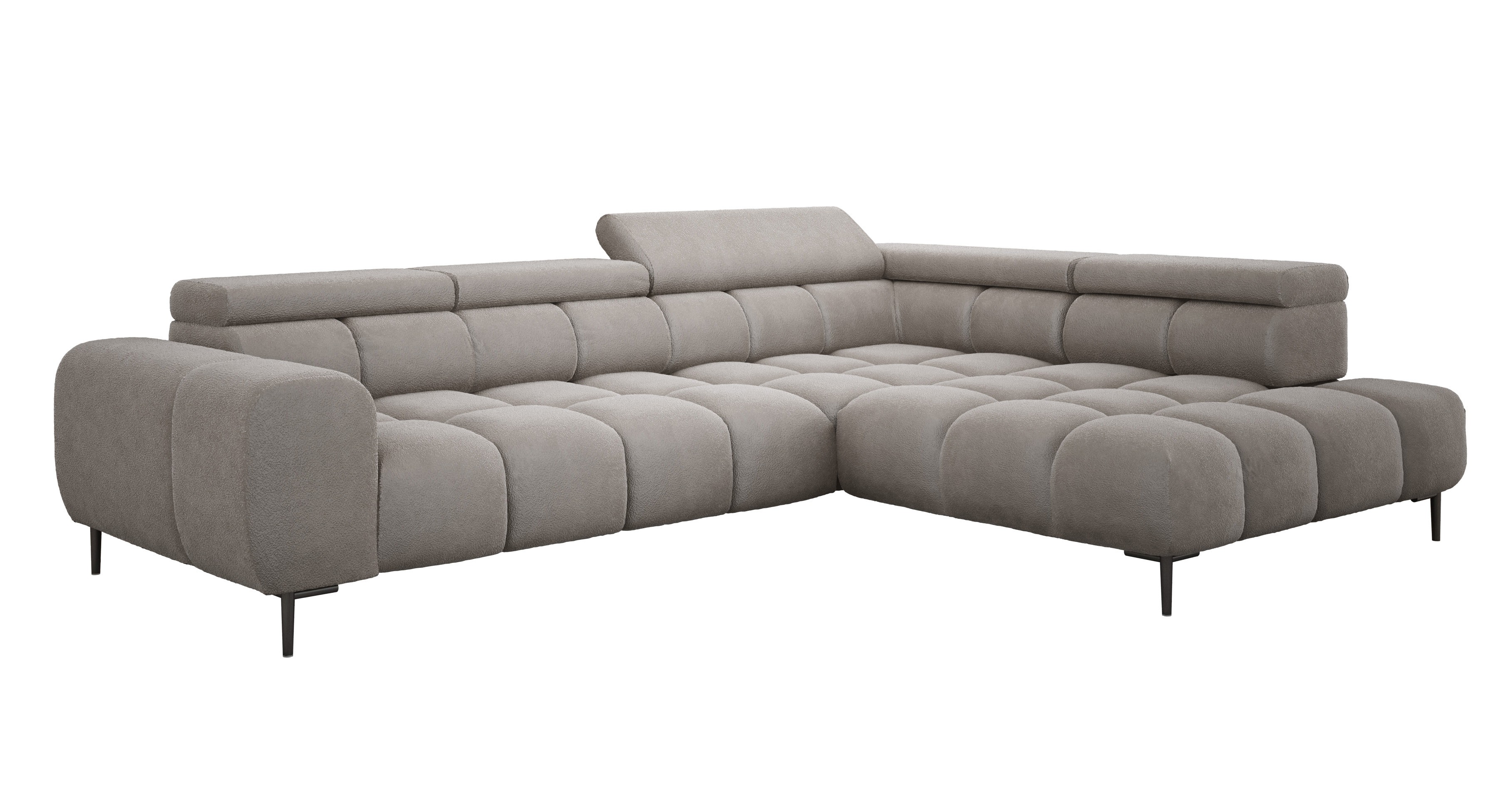 Stylowe pikowane siedzisko i wysokie metalowe nóżki (dostępne w kolorze czarnym lub złotym) nadają narożnikowi lekko loftowy, a jednocześnie nowoczesny charakter.