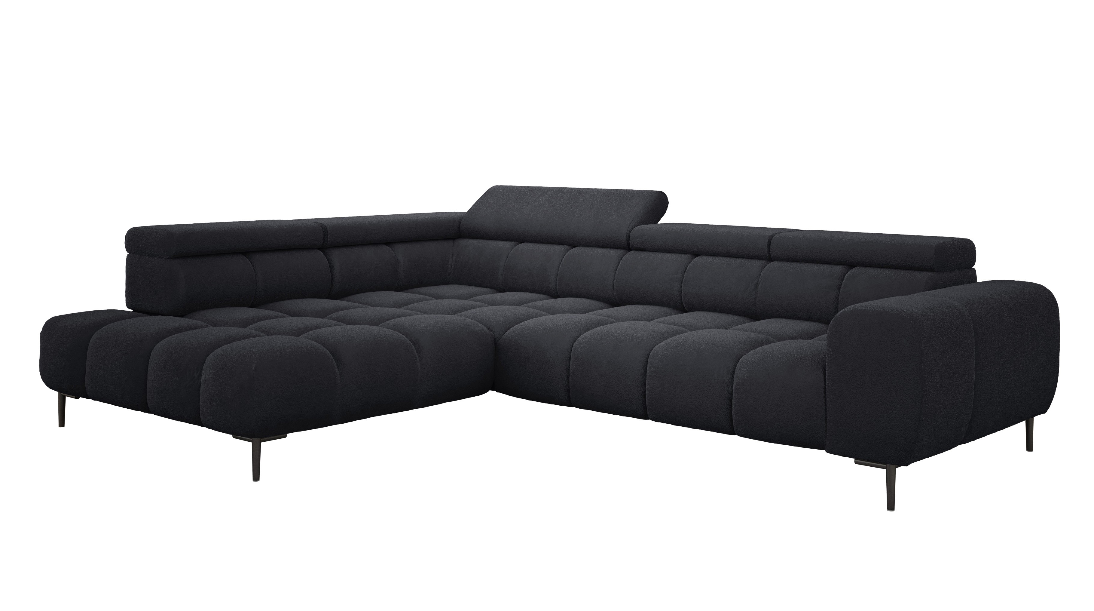 Stylowe pikowane siedzisko i wysokie metalowe nóżki (dostępne w kolorze czarnym lub złotym) nadają narożnikowi lekko loftowy, a jednocześnie nowoczesny charakter.