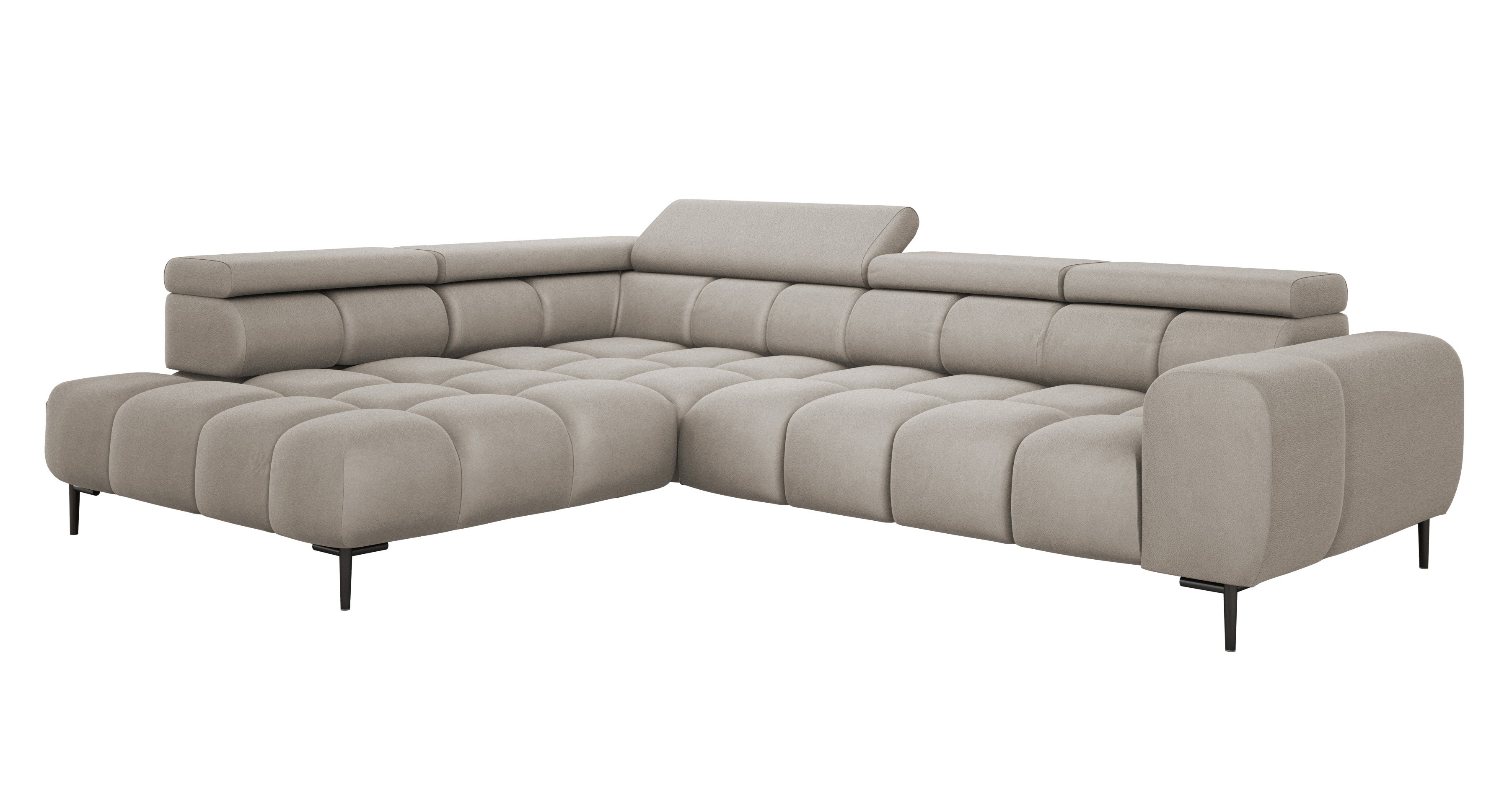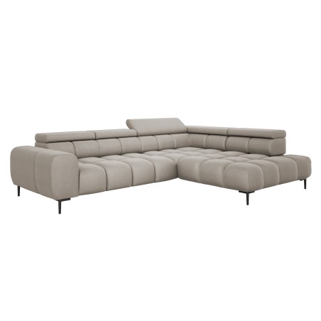 Stylowe pikowane siedzisko i wysokie metalowe nóżki (dostępne w kolorze czarnym lub złotym) nadają narożnikowi lekko loftowy, a jednocześnie nowoczesny charakter.