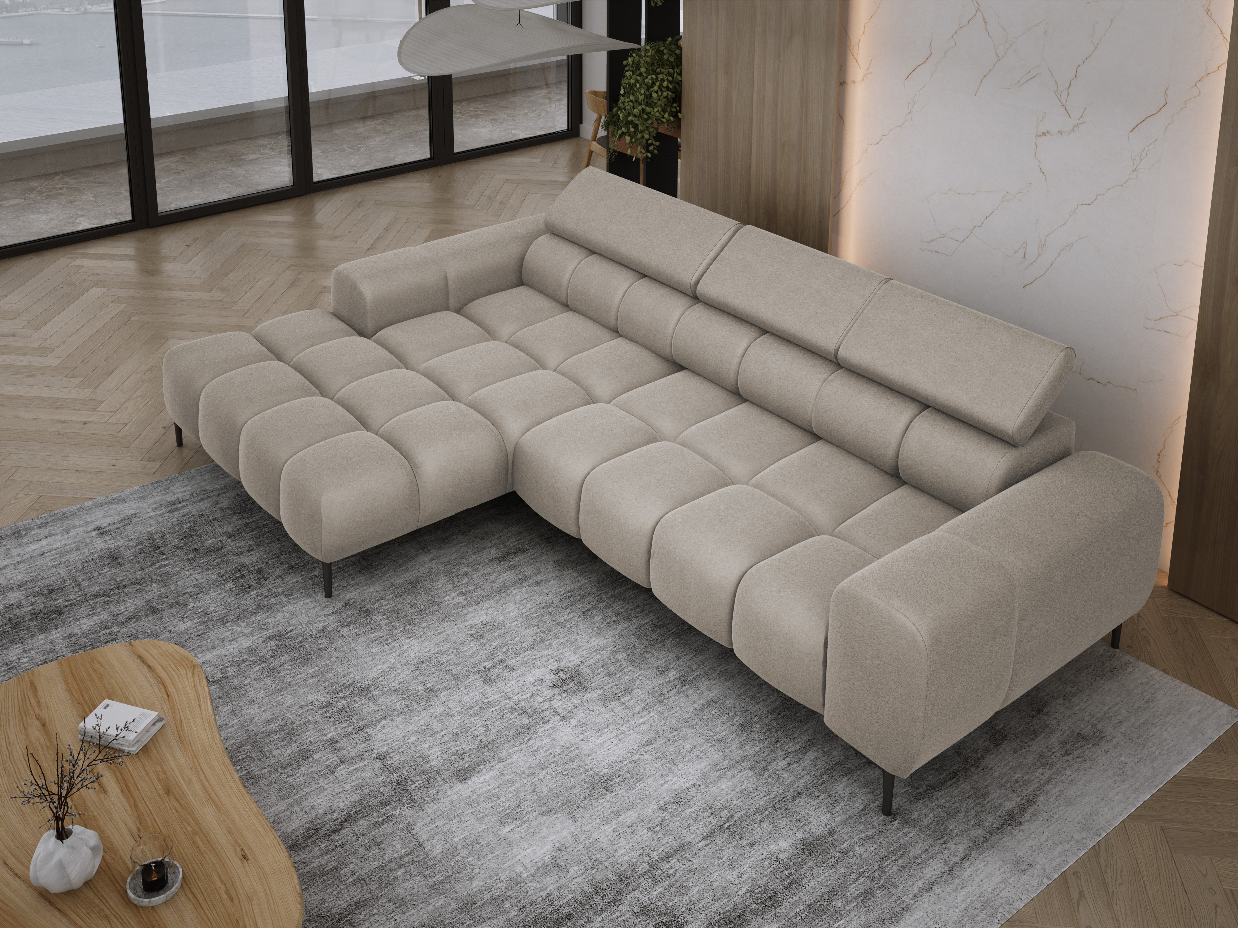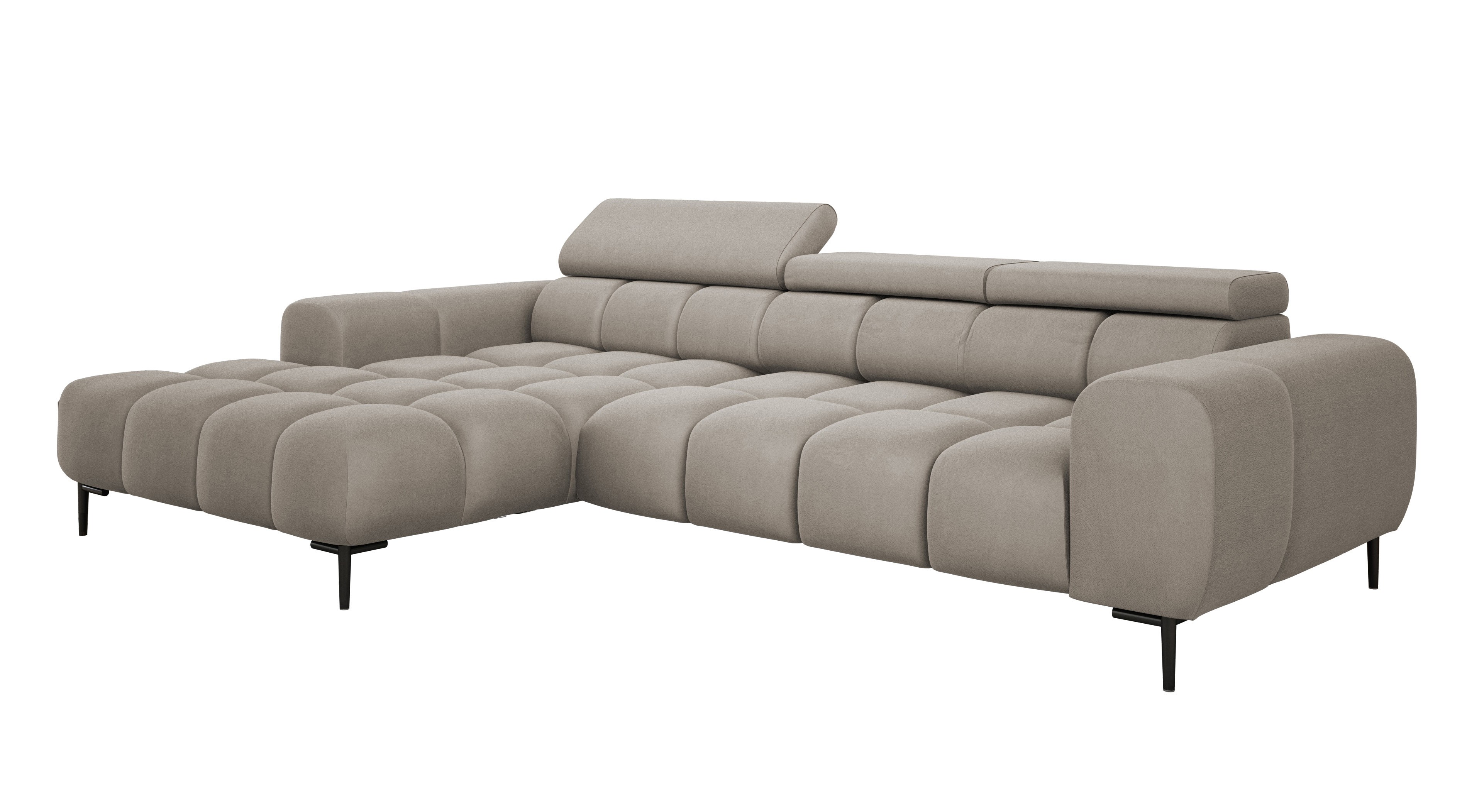 Pikowane siedzisko nadaje narożnikowi nowoczesnego charakteru, a wysokie metalowe nóżki (czarne lub złote) w stylu loftowym dodają mu lekkości i elegancji.