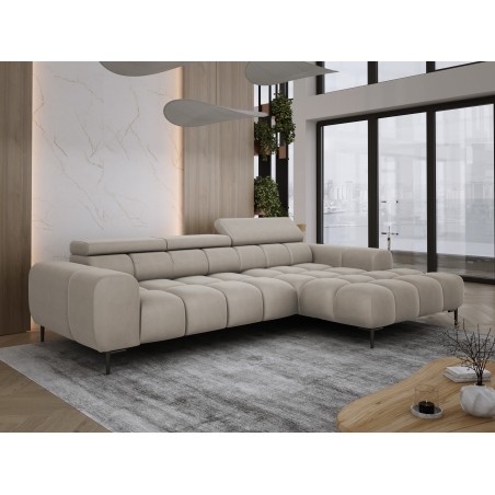Pikowane siedzisko nadaje narożnikowi nowoczesnego charakteru, a wysokie metalowe nóżki (czarne lub złote) w stylu loftowym dodają mu lekkości i elegancji.