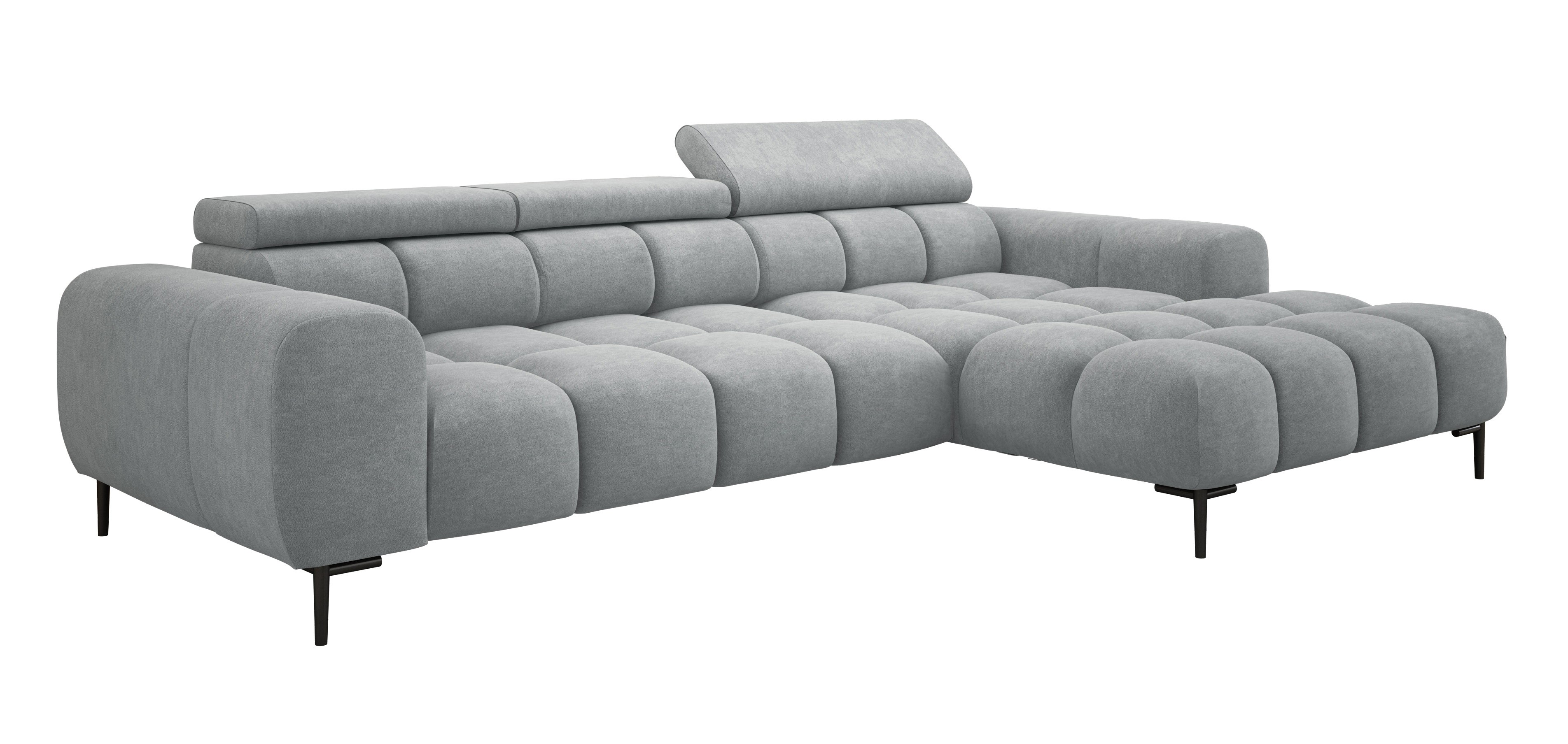 Pikowane siedzisko nadaje narożnikowi nowoczesnego charakteru, a wysokie metalowe nóżki (czarne lub złote) w stylu loftowym dodają mu lekkości i elegancji.