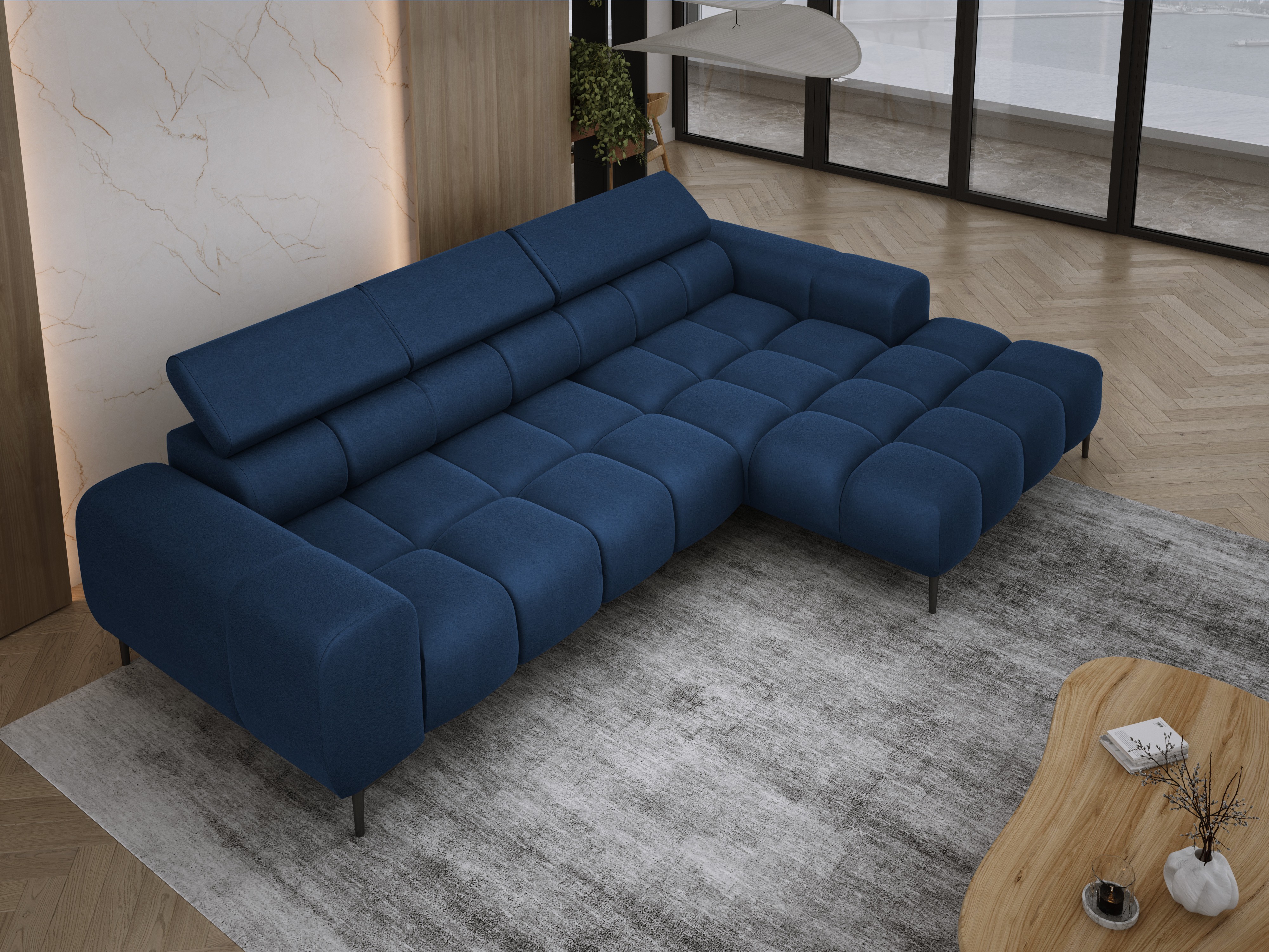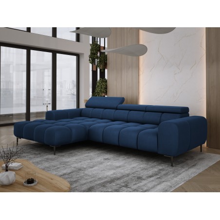 Pikowane siedzisko nadaje narożnikowi nowoczesnego charakteru, a wysokie metalowe nóżki (czarne lub złote) w stylu loftowym dodają mu lekkości i elegancji.