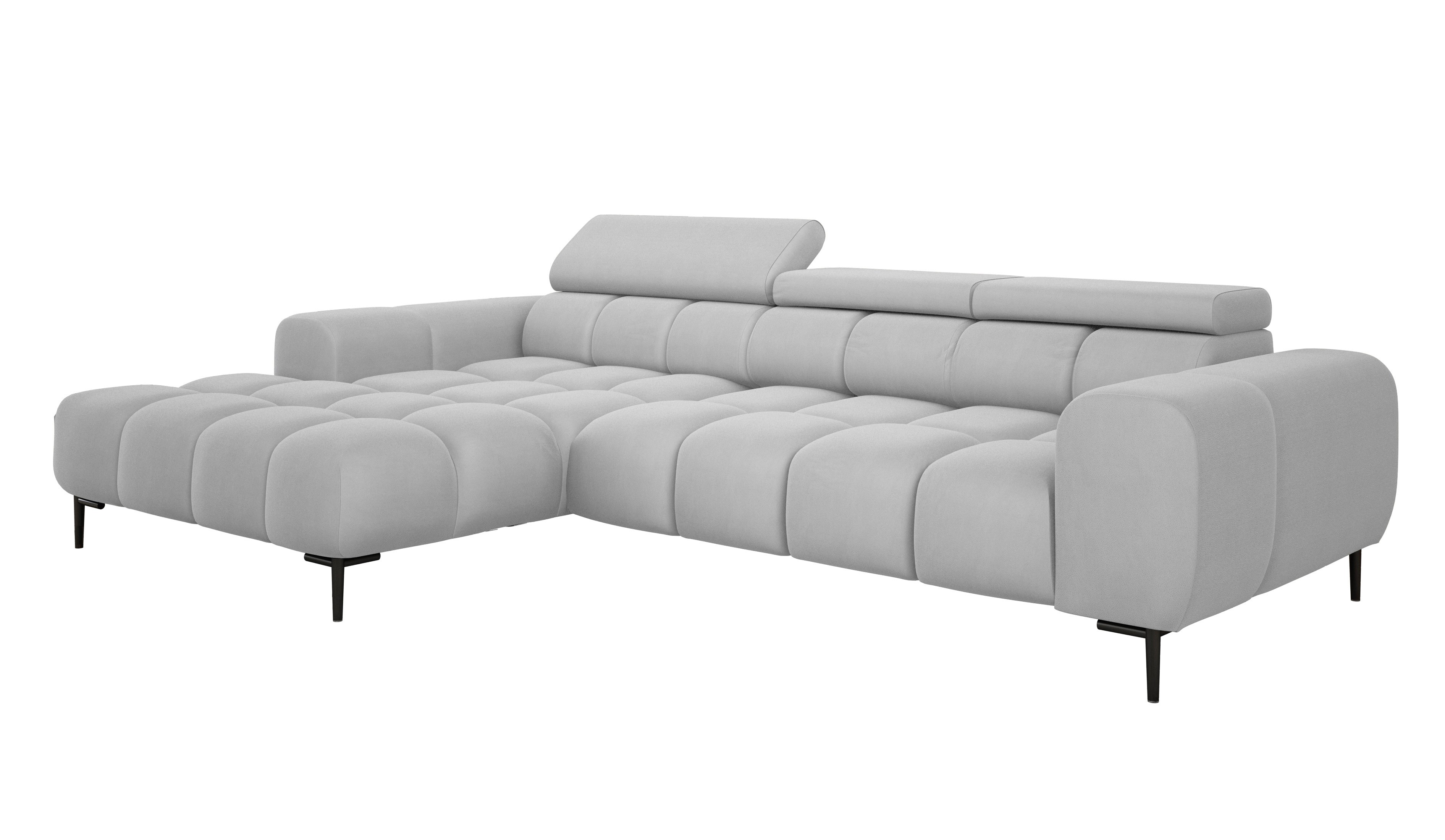 Pikowane siedzisko nadaje narożnikowi nowoczesnego charakteru, a wysokie metalowe nóżki (czarne lub złote) w stylu loftowym dodają mu lekkości i elegancji.