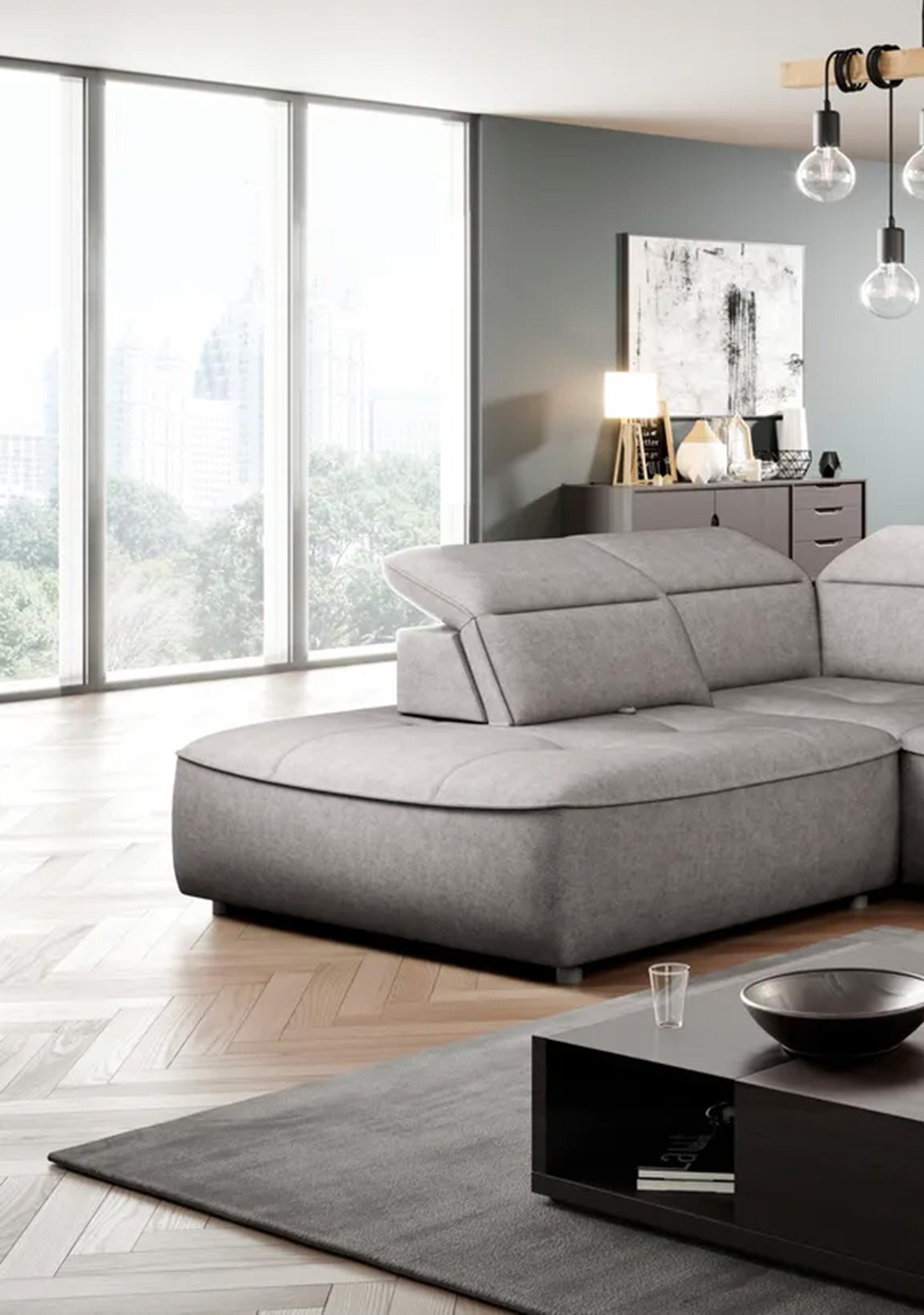 Subtelne pikowania, regulowane zagłówki i prosta forma sprawiają, że narożnik doskonale pasuje do każdego wnętrza.