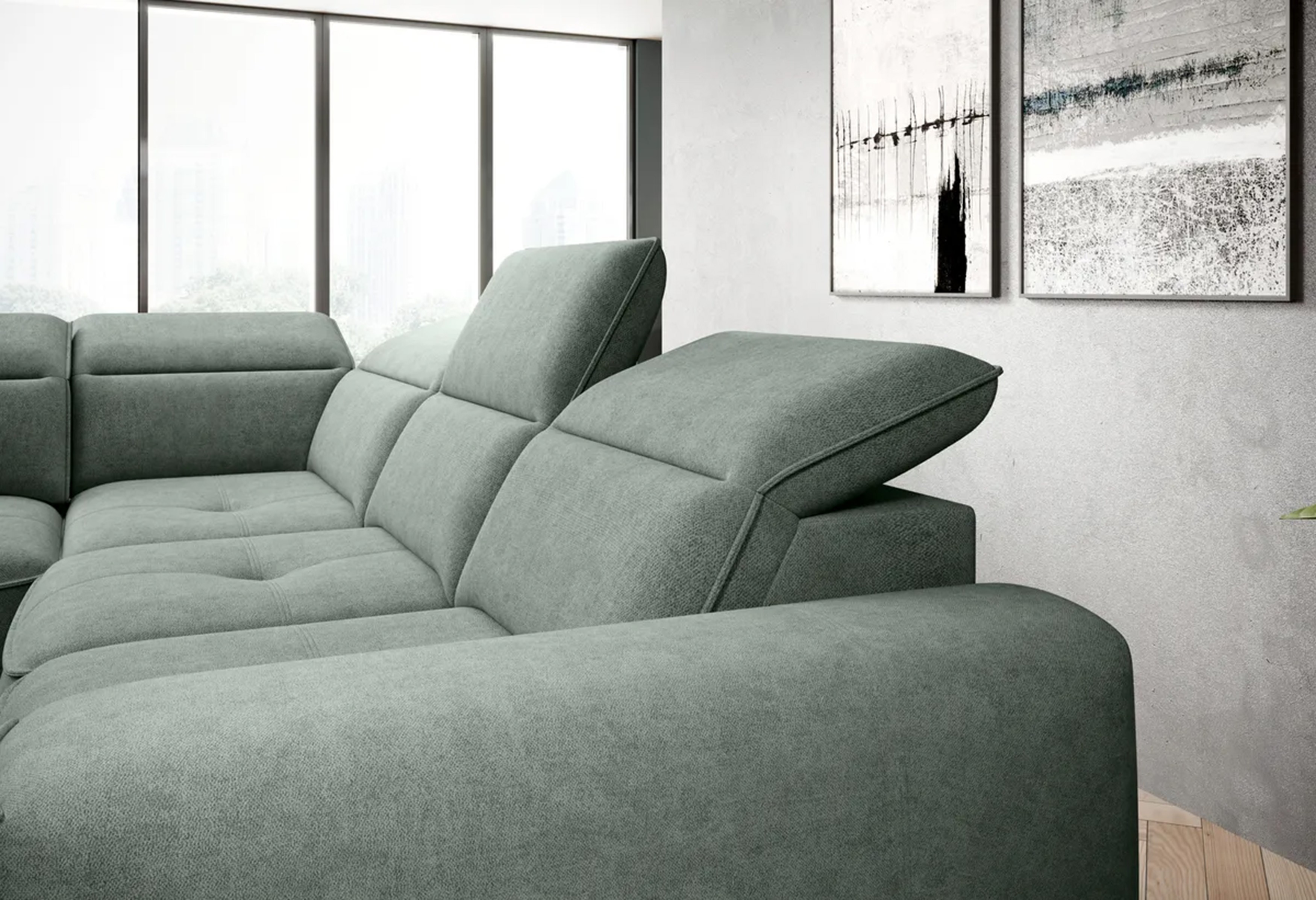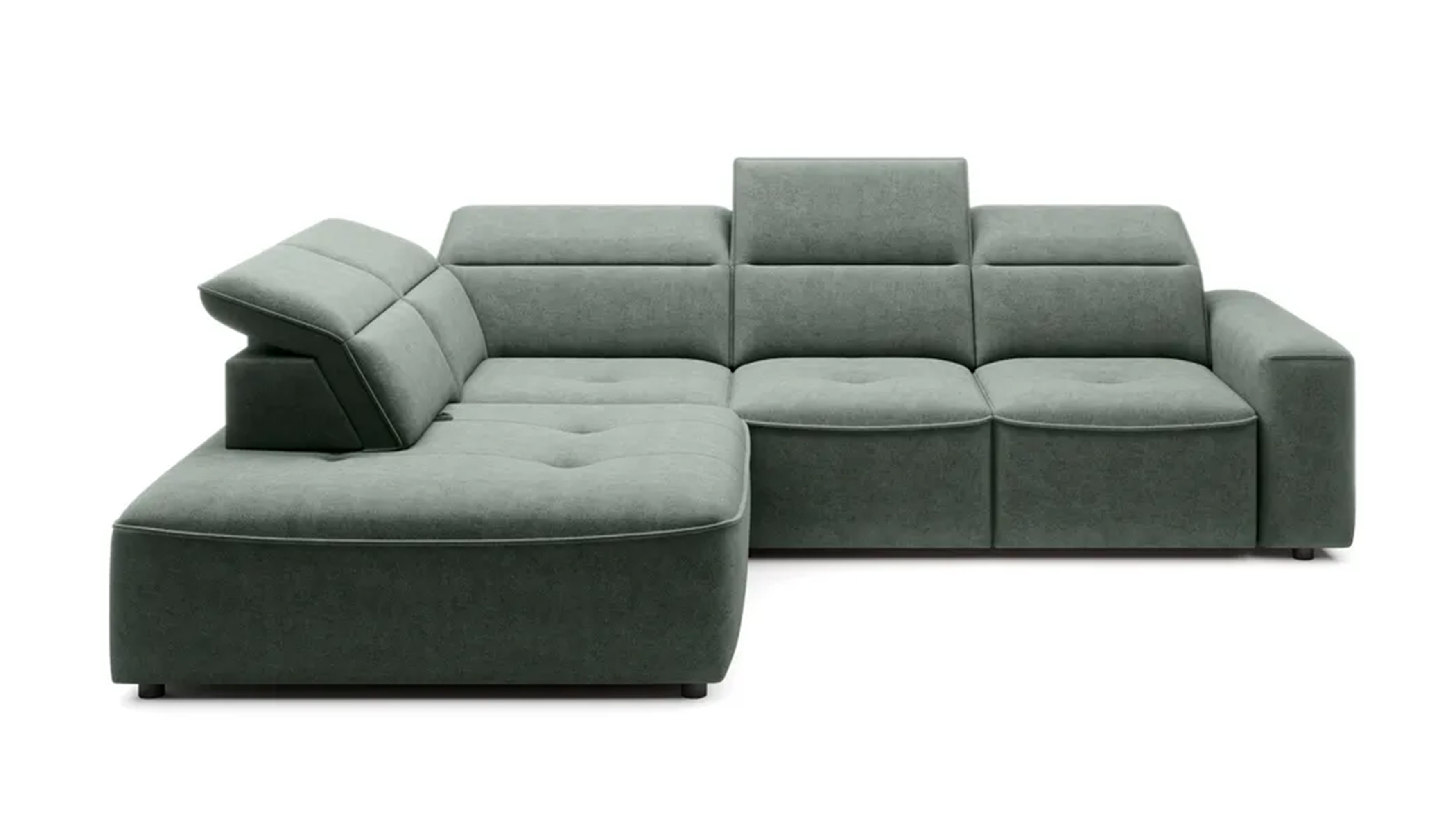 Subtelne pikowania, regulowane zagłówki i prosta forma sprawiają, że narożnik doskonale pasuje do każdego wnętrza.