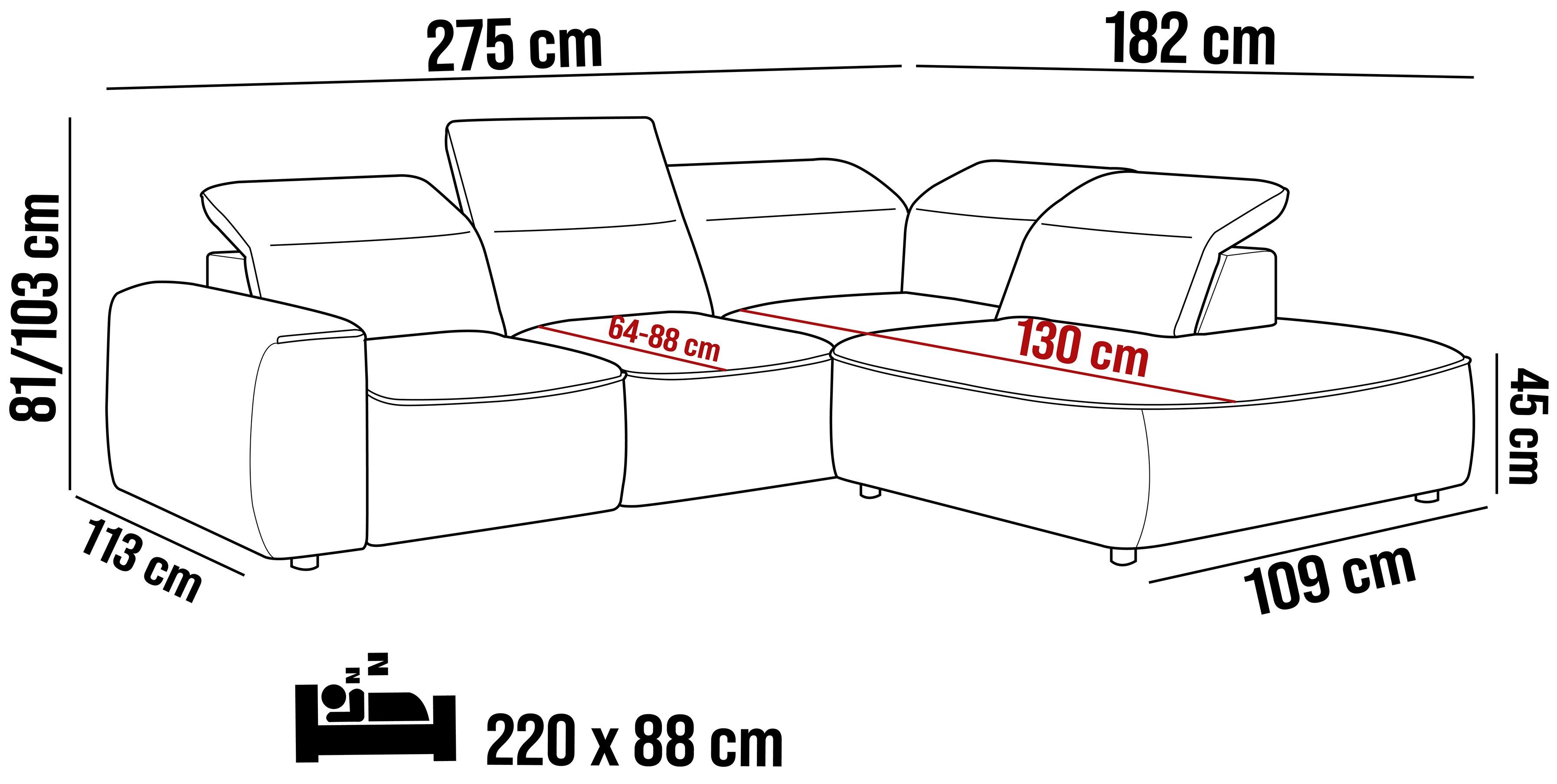 Elektryczna funkcja spania gwarantuje komfort i wygodę każdego dnia, a funkcja RELAX z regulowanymi zagłówkami pozwala dostosować narożnik do indywidualnych potrzeb. Dzięki regulowanej głębokości siedziska odpoczynek staje się jeszcze bardziej komfortowy.