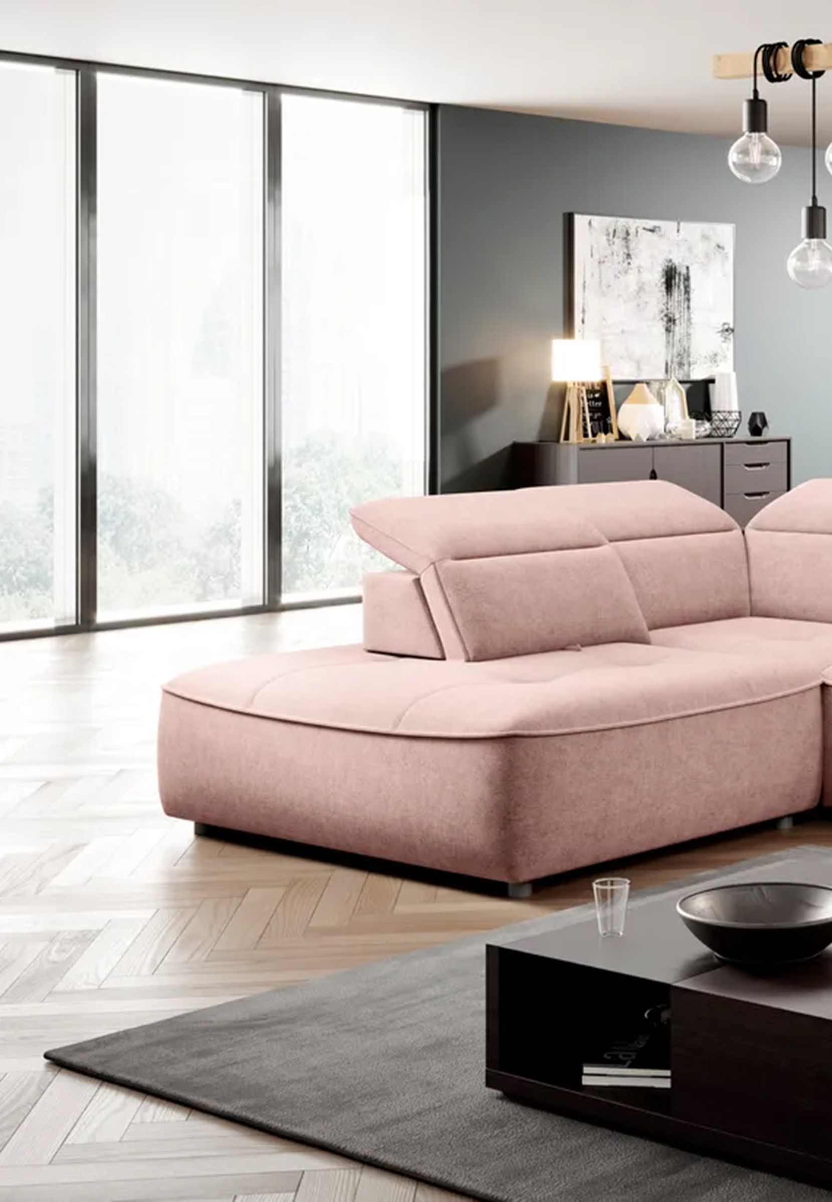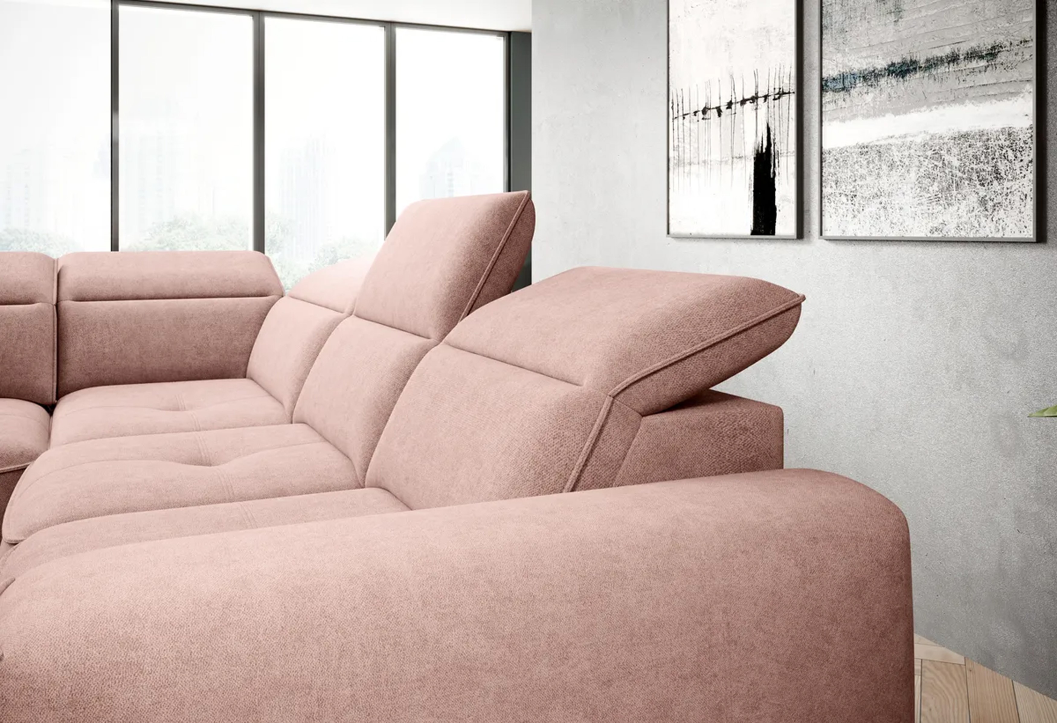 Subtelne pikowania, regulowane zagłówki i prosta forma sprawiają, że narożnik doskonale pasuje do każdego wnętrza.