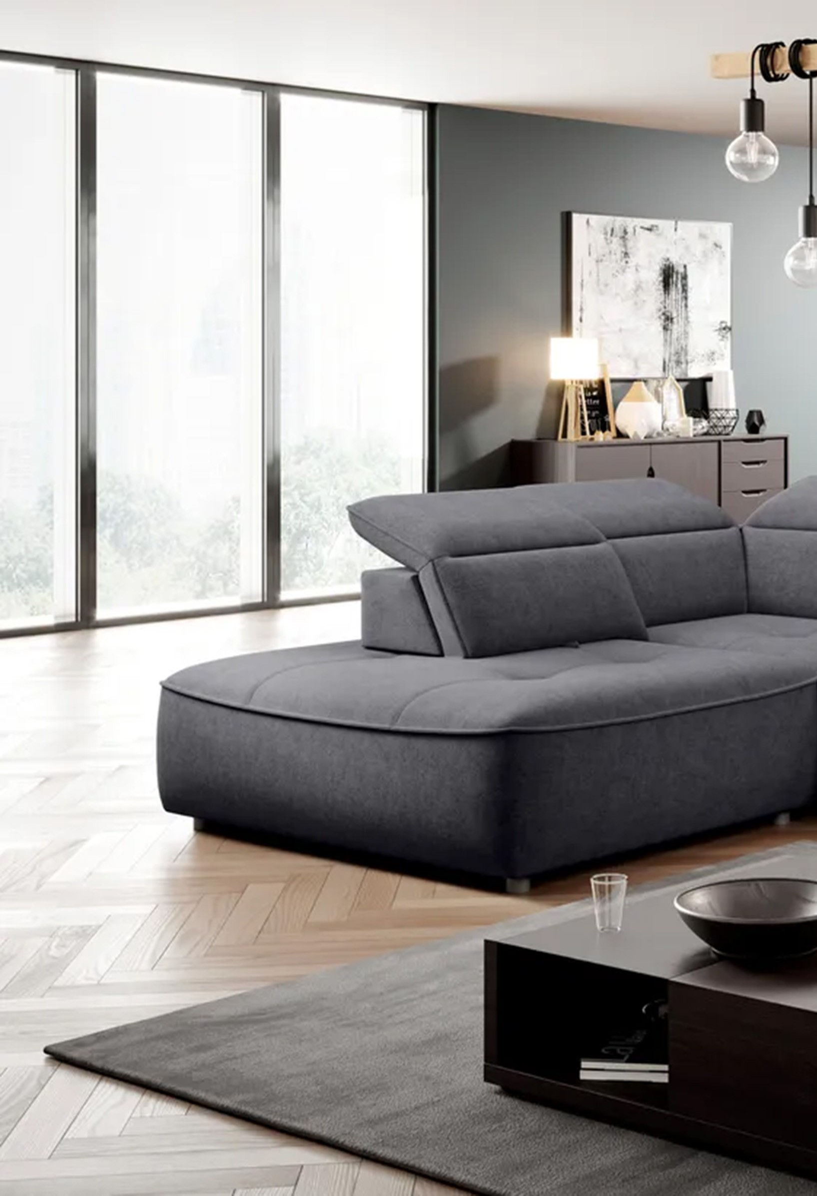 Subtelne pikowania, regulowane zagłówki i prosta forma sprawiają, że narożnik doskonale pasuje do każdego wnętrza.