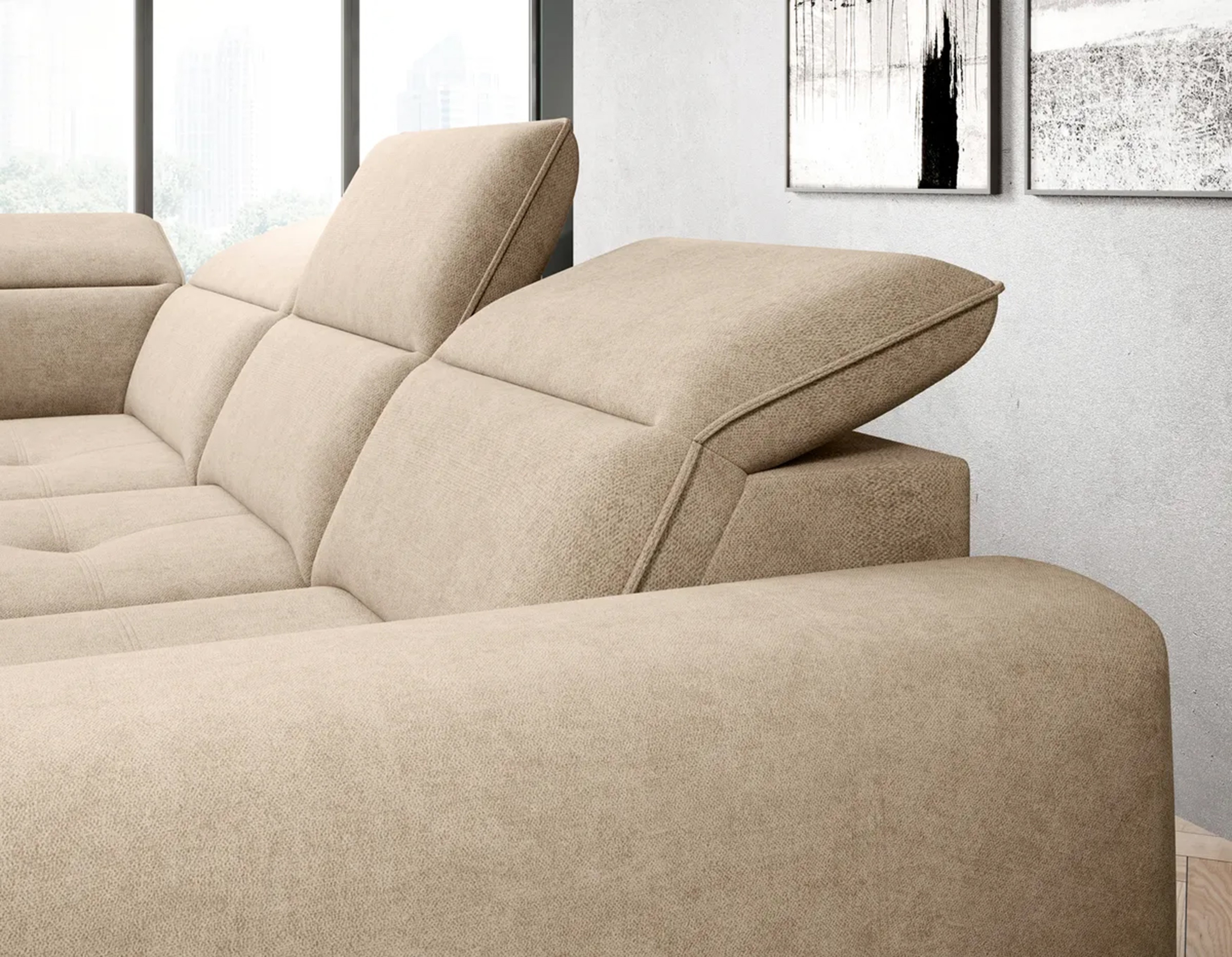 Subtelne pikowania, regulowane zagłówki i prosta forma sprawiają, że narożnik doskonale pasuje do każdego wnętrza.