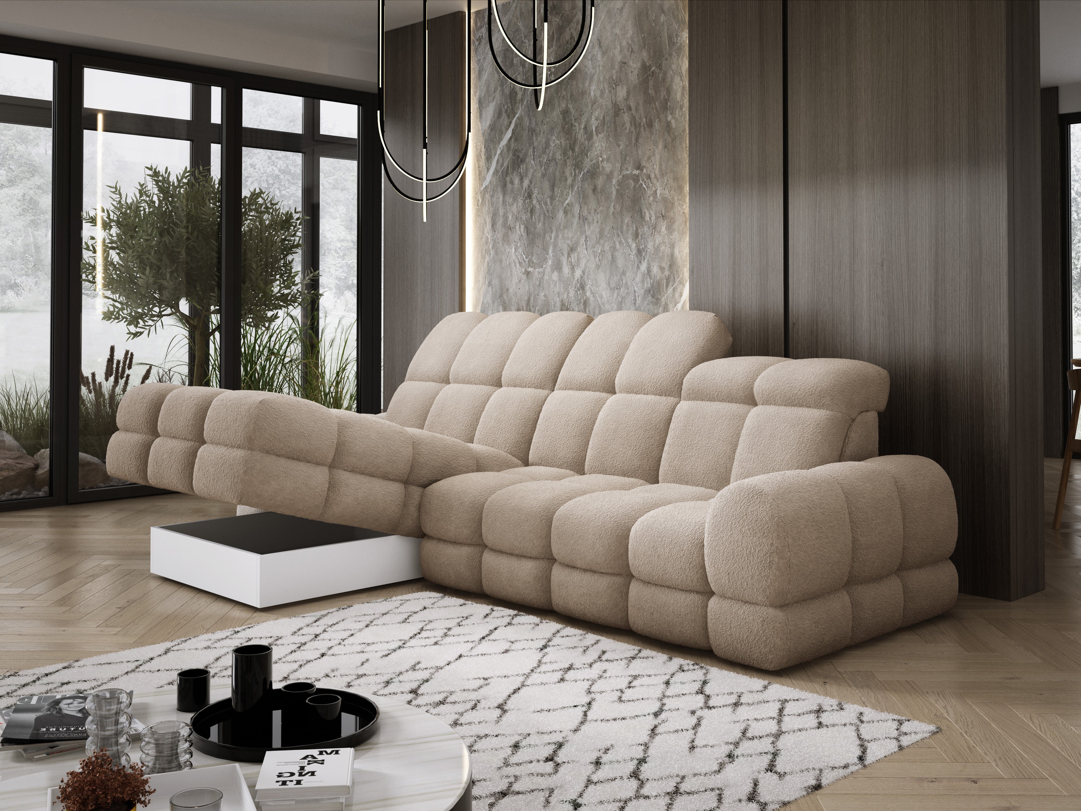 Model został wyposażony w elektrycznie rozkładaną funkcję spania, która w kilka chwil zamienia narożnik w komfortowe łóżko – idealne do codziennego relaksu lub dla gości.