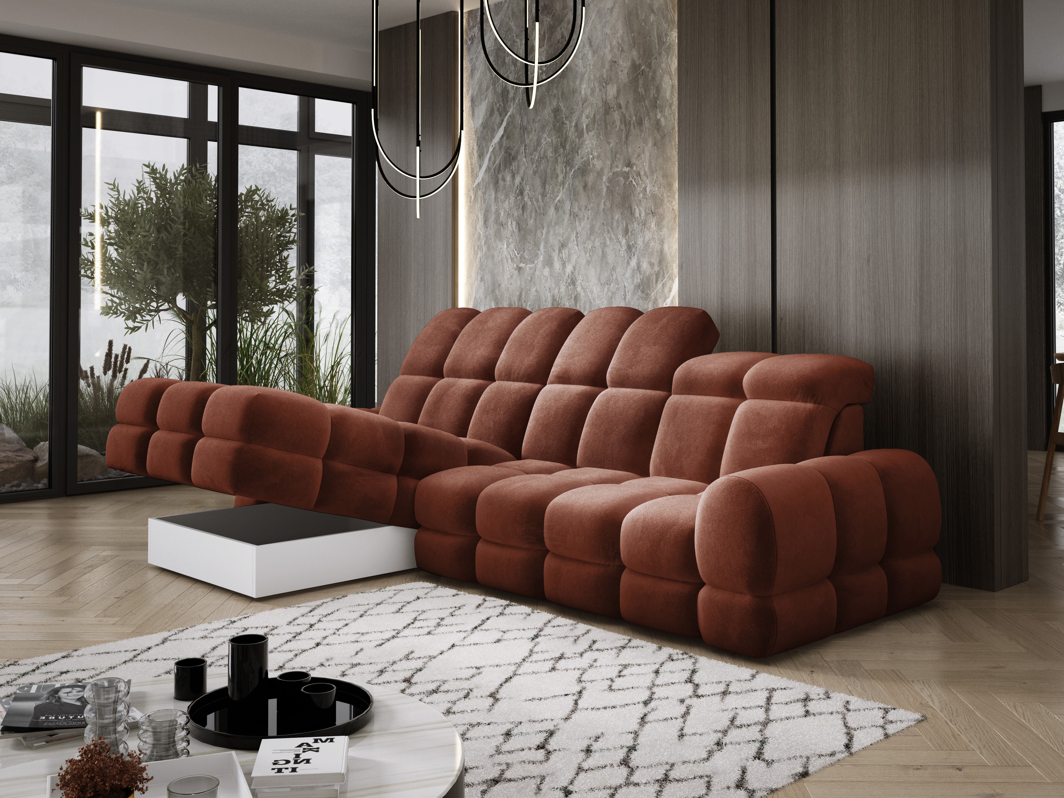 Model został wyposażony w elektrycznie rozkładaną funkcję spania, która w kilka chwil zamienia narożnik w komfortowe łóżko – idealne do codziennego relaksu lub dla gości.