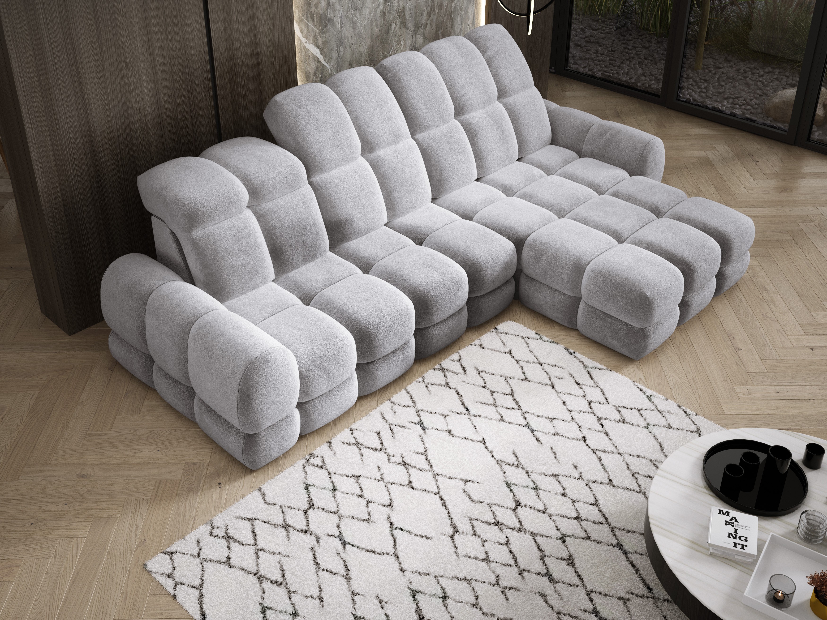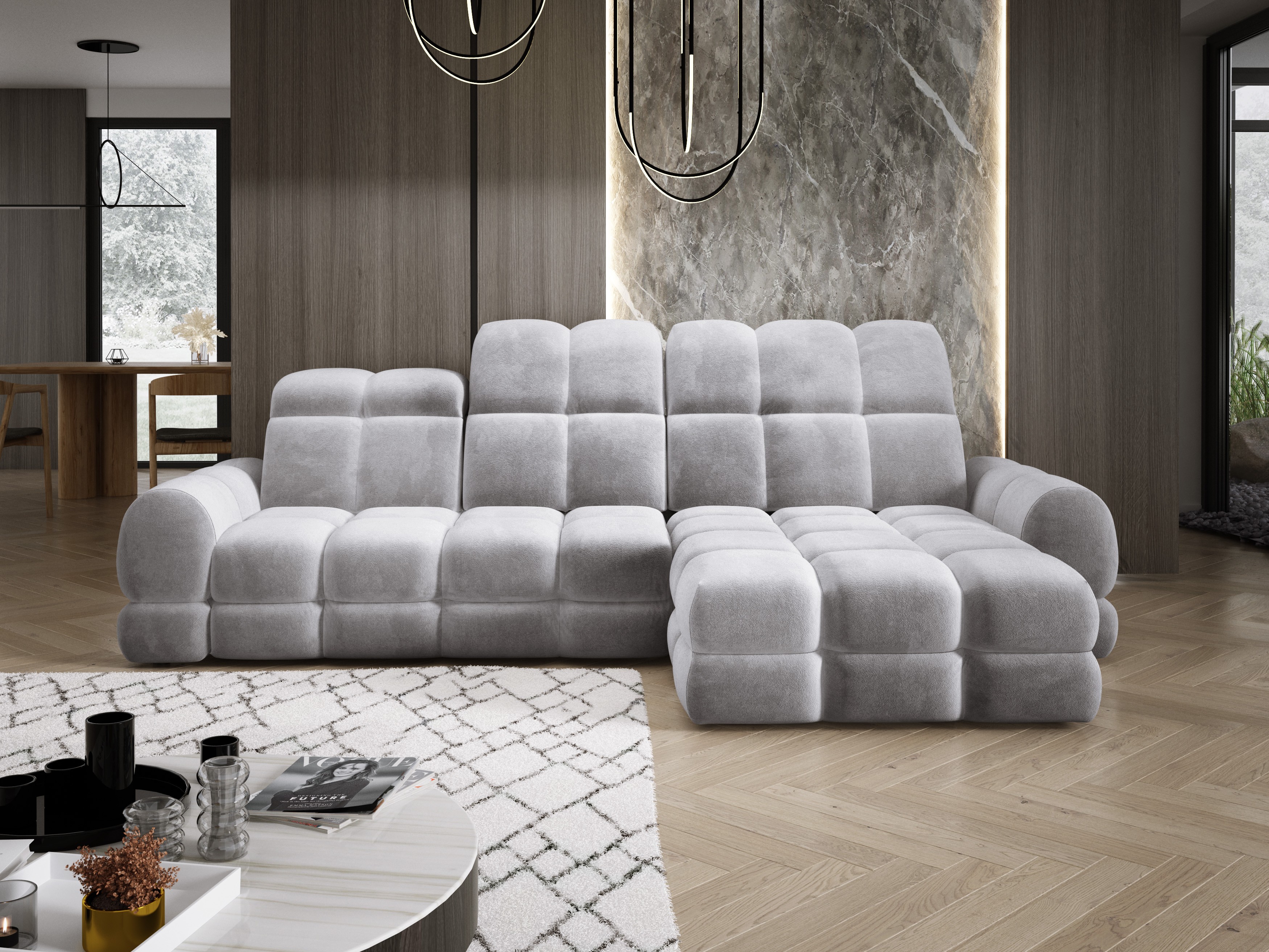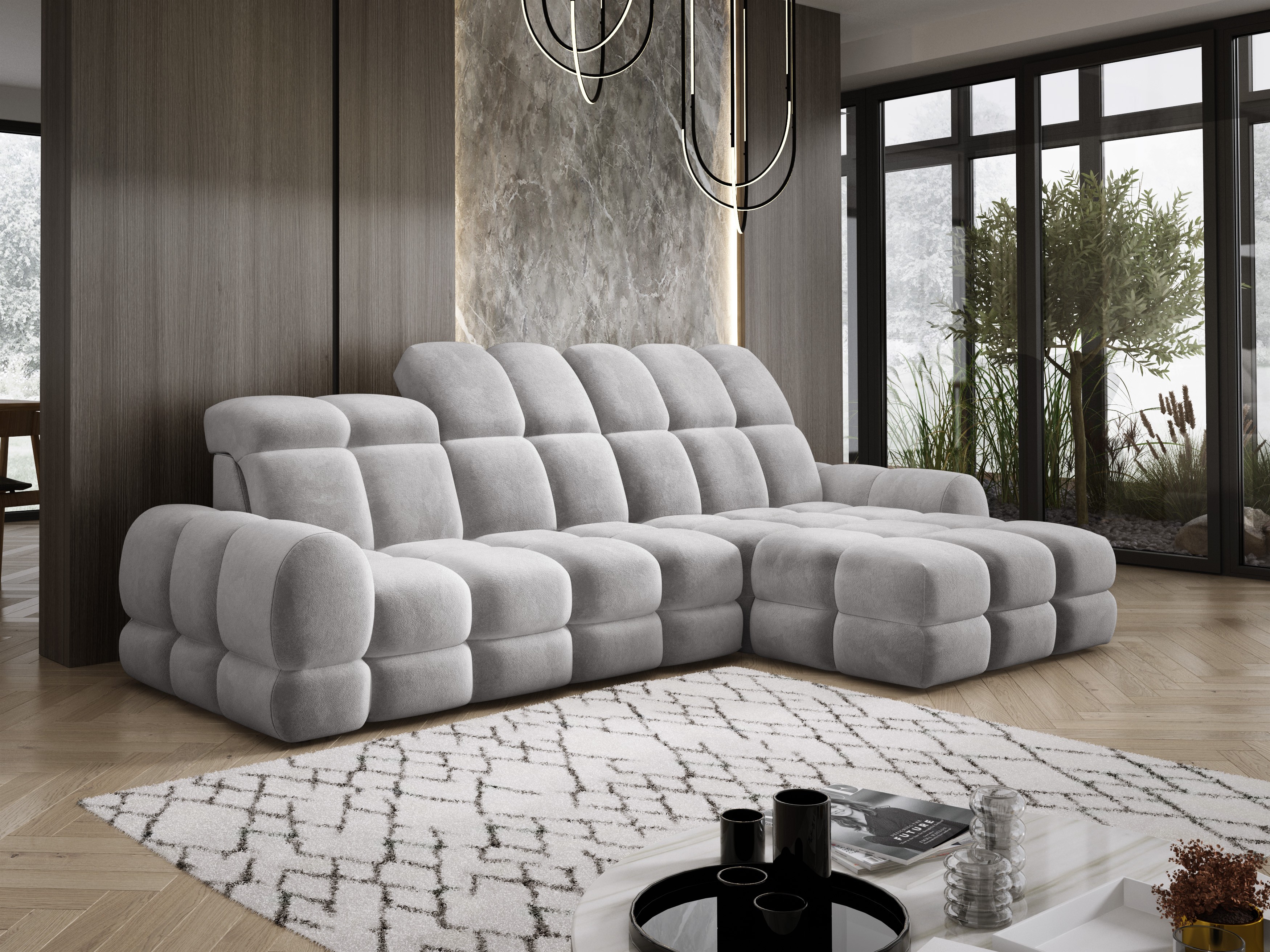 Model został wyposażony w elektrycznie rozkładaną funkcję spania, która w kilka chwil zamienia narożnik w komfortowe łóżko – idealne do codziennego relaksu lub dla gości.