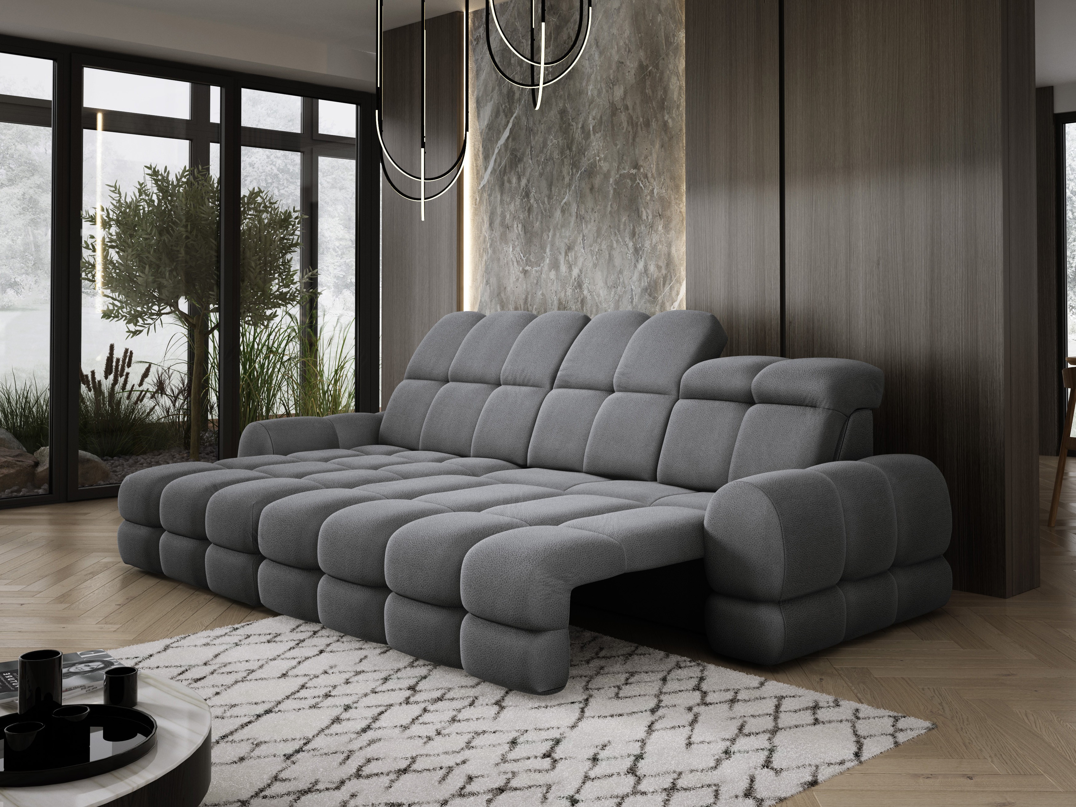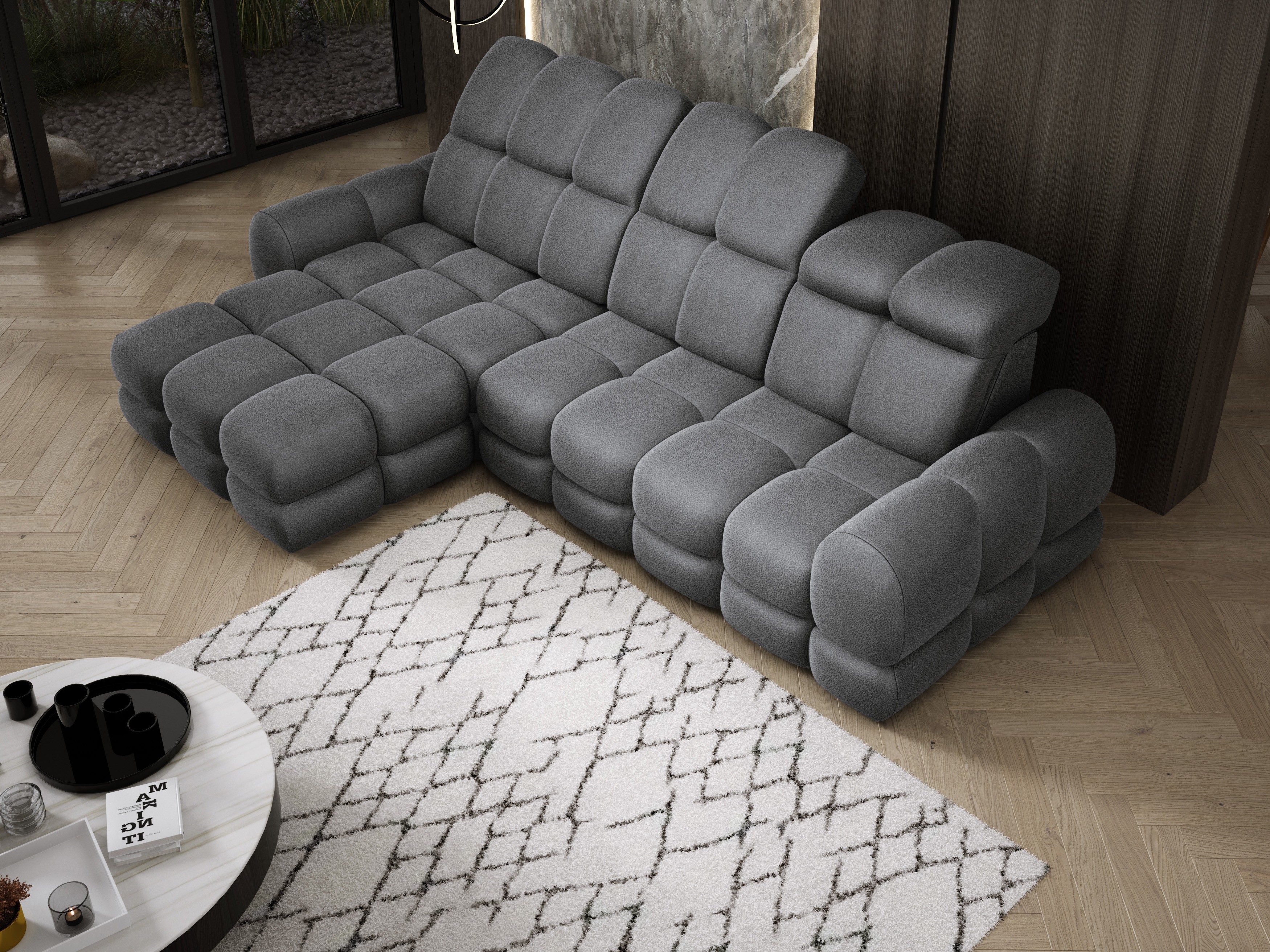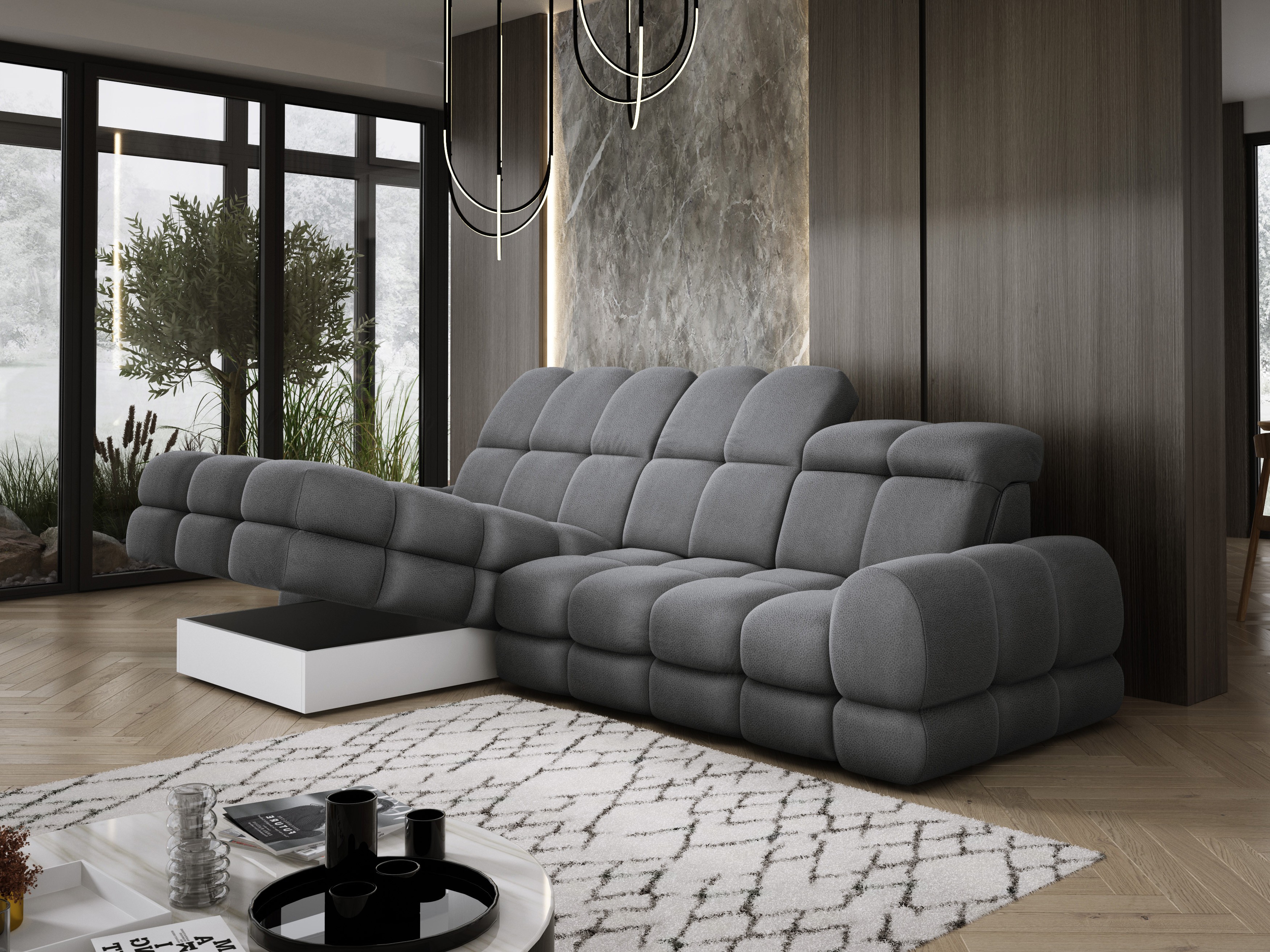 Model został wyposażony w elektrycznie rozkładaną funkcję spania, która w kilka chwil zamienia narożnik w komfortowe łóżko – idealne do codziennego relaksu lub dla gości.