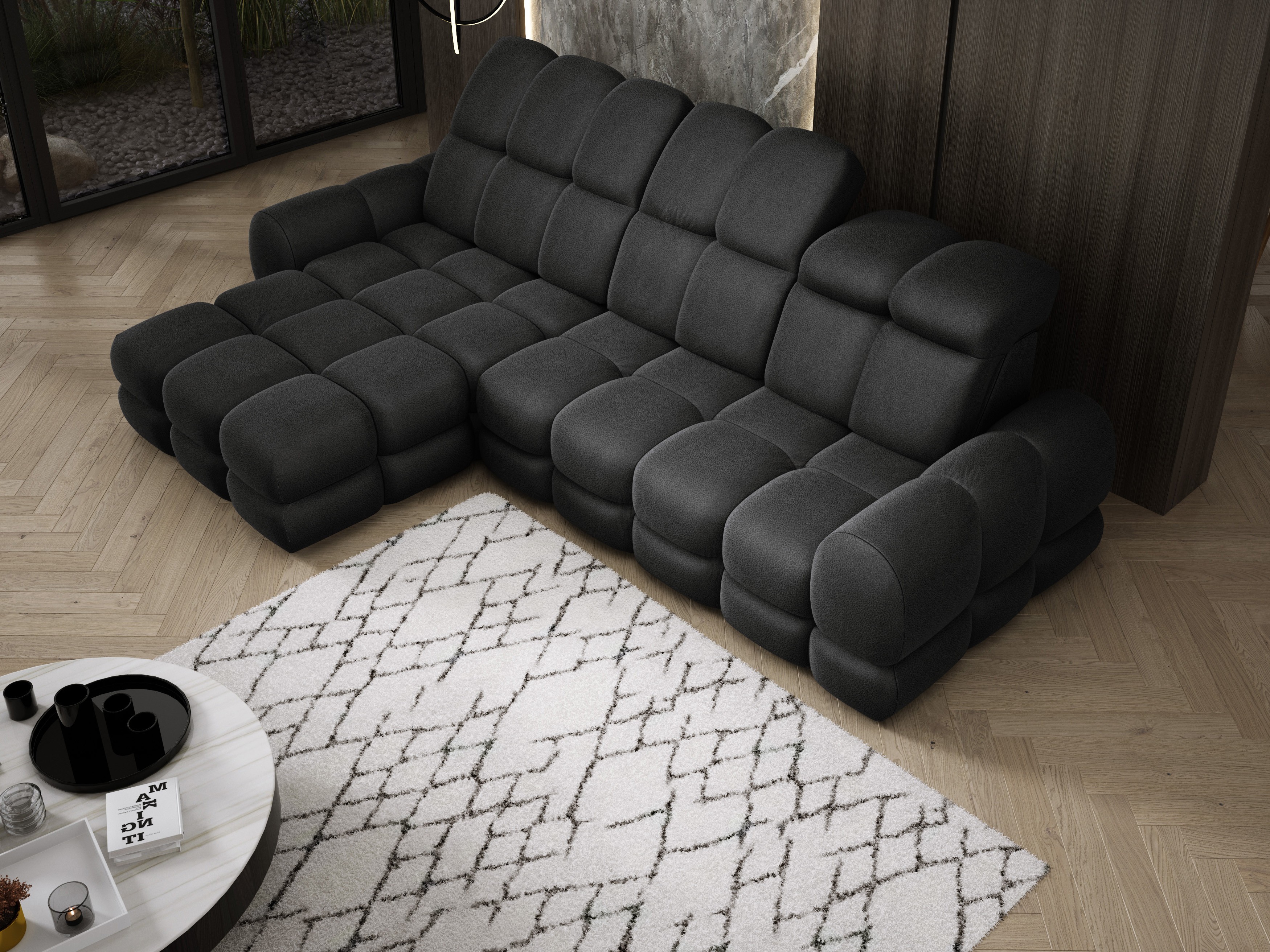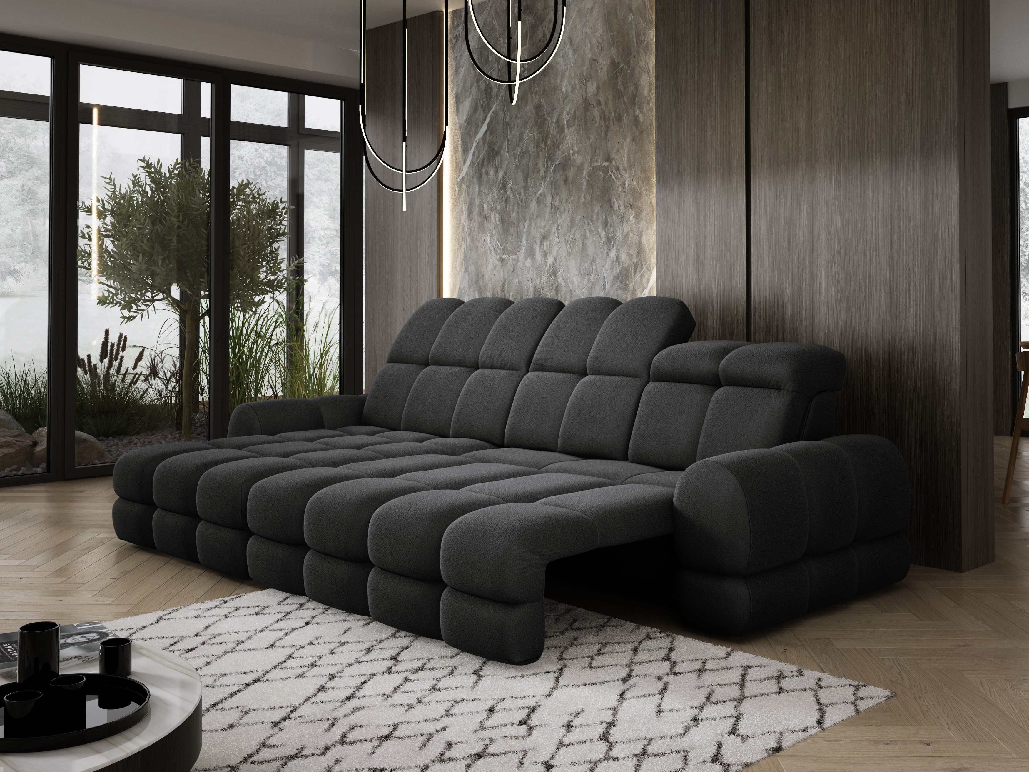 Model został wyposażony w elektrycznie rozkładaną funkcję spania, która w kilka chwil zamienia narożnik w komfortowe łóżko – idealne do codziennego relaksu lub dla gości.