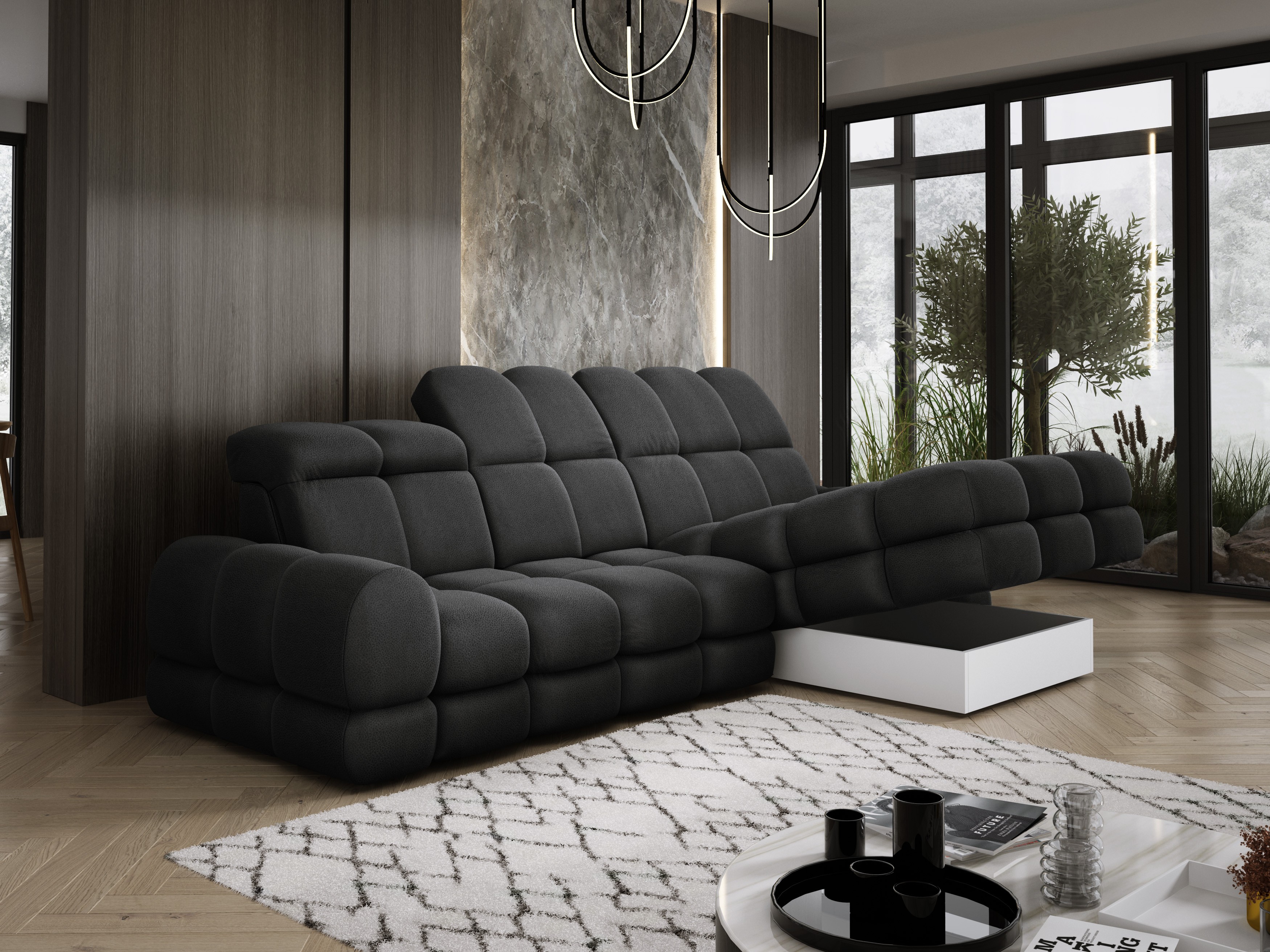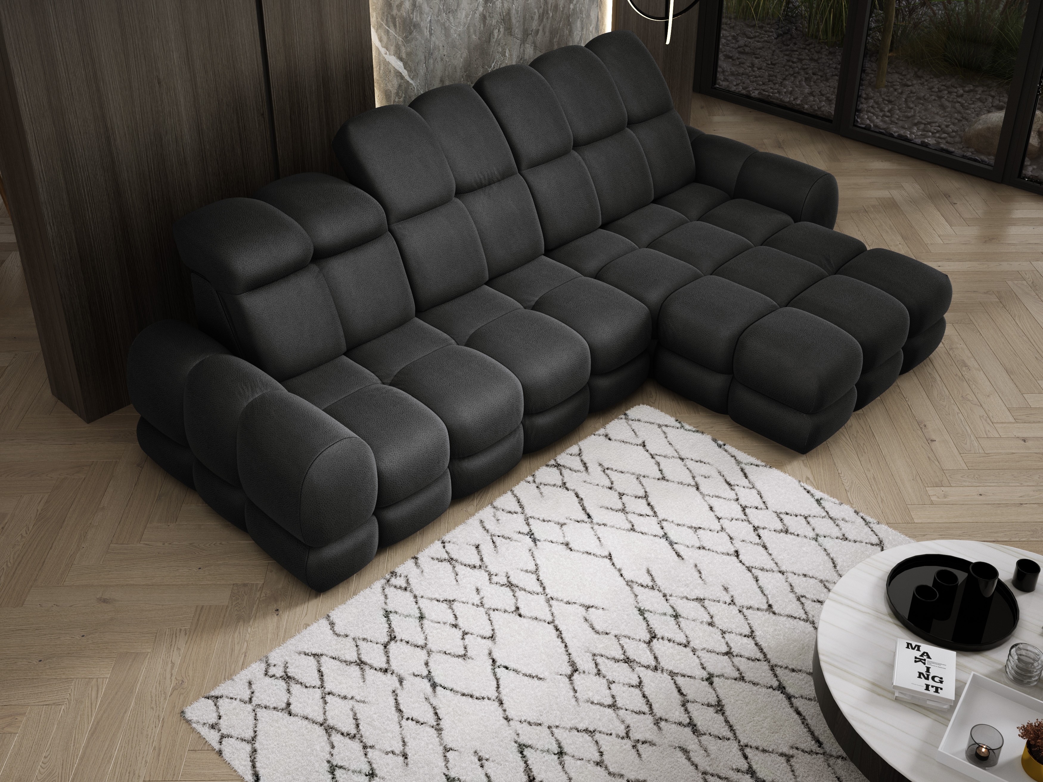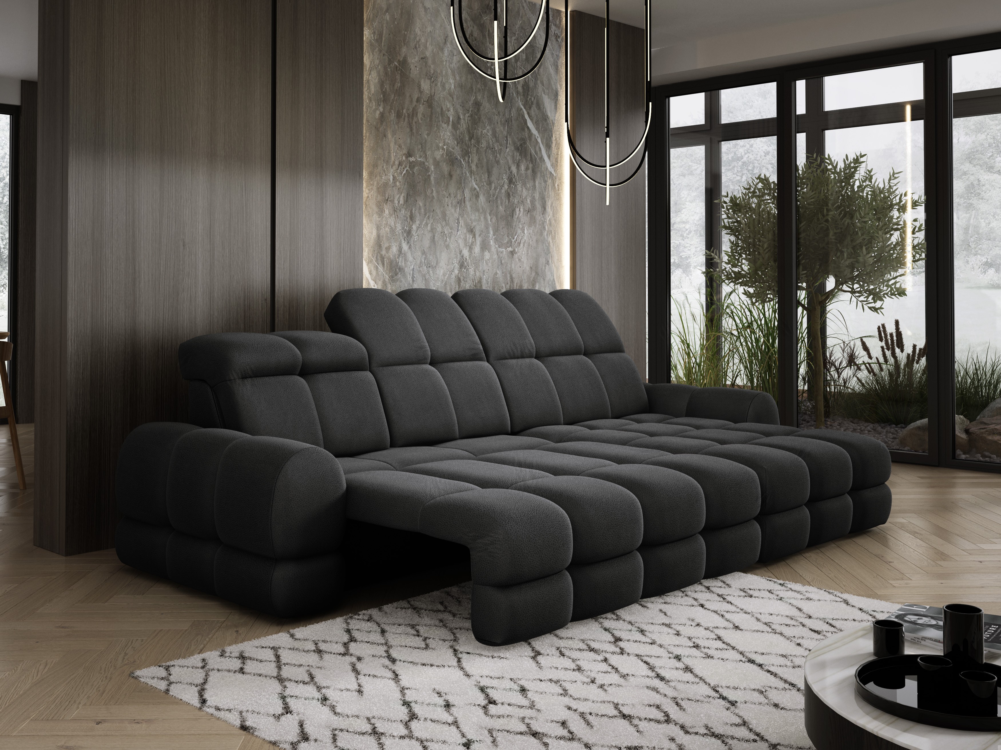 Model został wyposażony w elektrycznie rozkładaną funkcję spania, która w kilka chwil zamienia narożnik w komfortowe łóżko – idealne do codziennego relaksu lub dla gości.