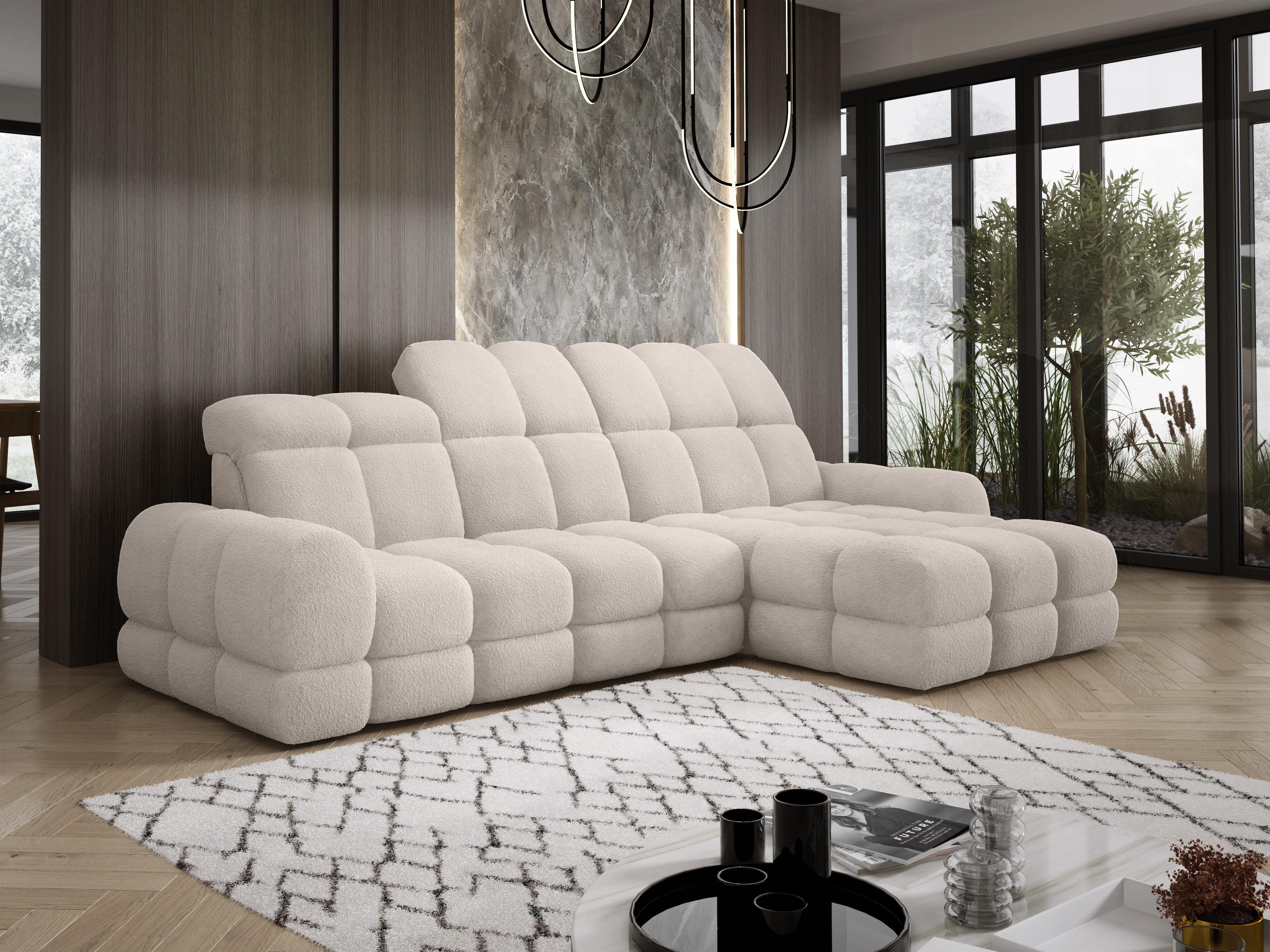 Model został wyposażony w elektrycznie rozkładaną funkcję spania, która w kilka chwil zamienia narożnik w komfortowe łóżko – idealne do codziennego relaksu lub dla gości.