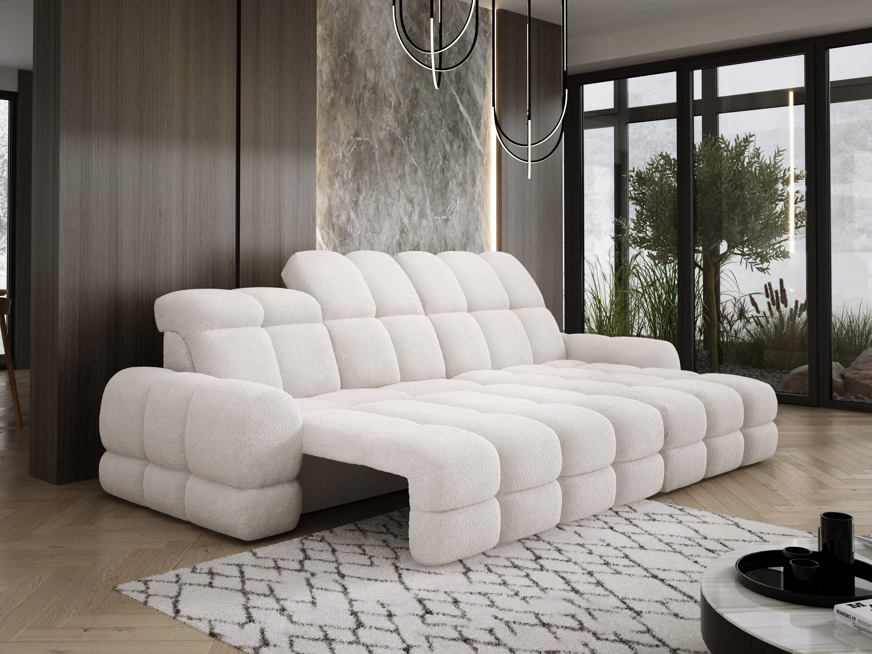Model został wyposażony w elektrycznie rozkładaną funkcję spania, która w kilka chwil zamienia narożnik w komfortowe łóżko – idealne do codziennego relaksu lub dla gości.