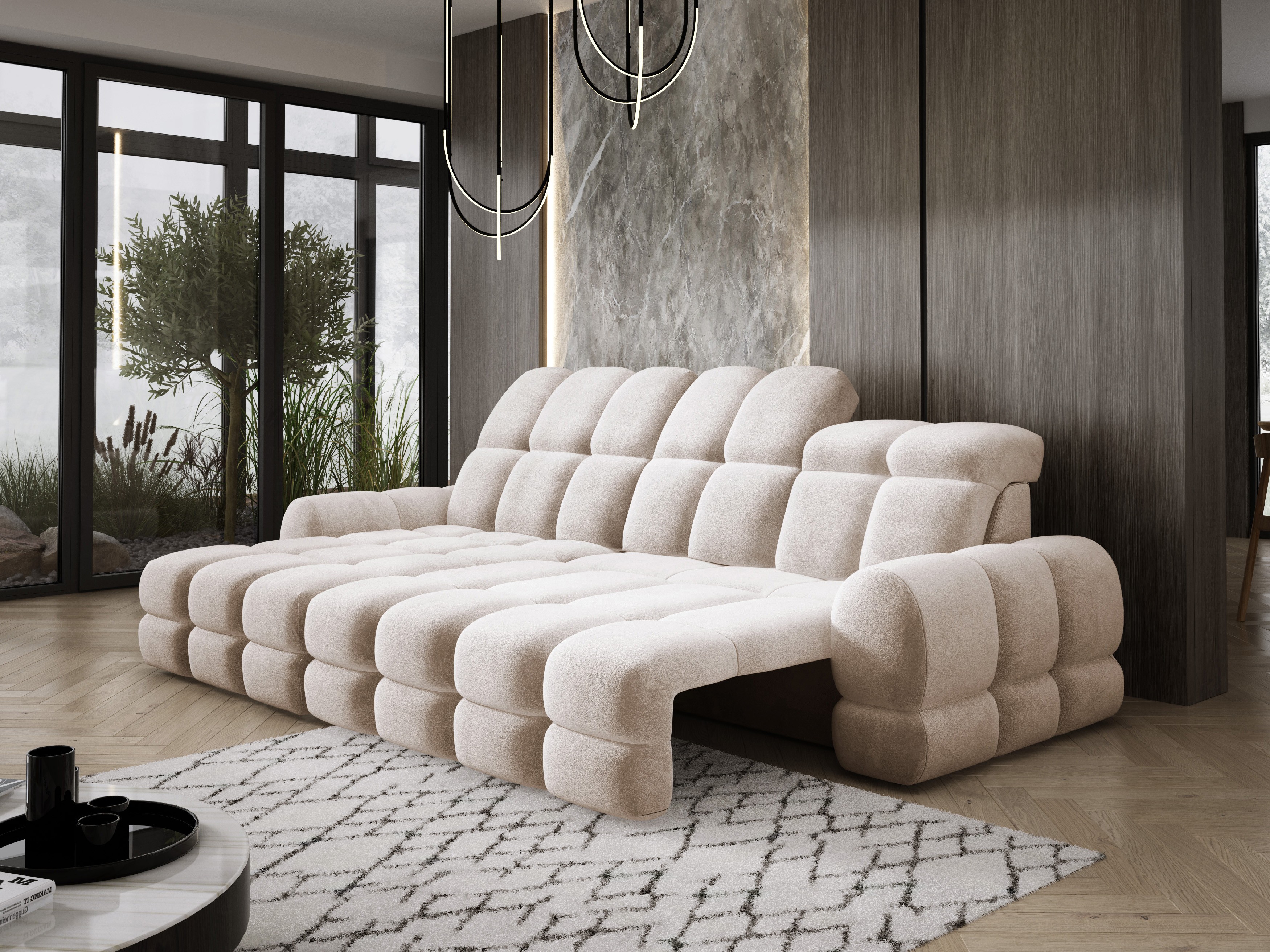 Model został wyposażony w elektrycznie rozkładaną funkcję spania, która w kilka chwil zamienia narożnik w komfortowe łóżko – idealne do codziennego relaksu lub dla gości.