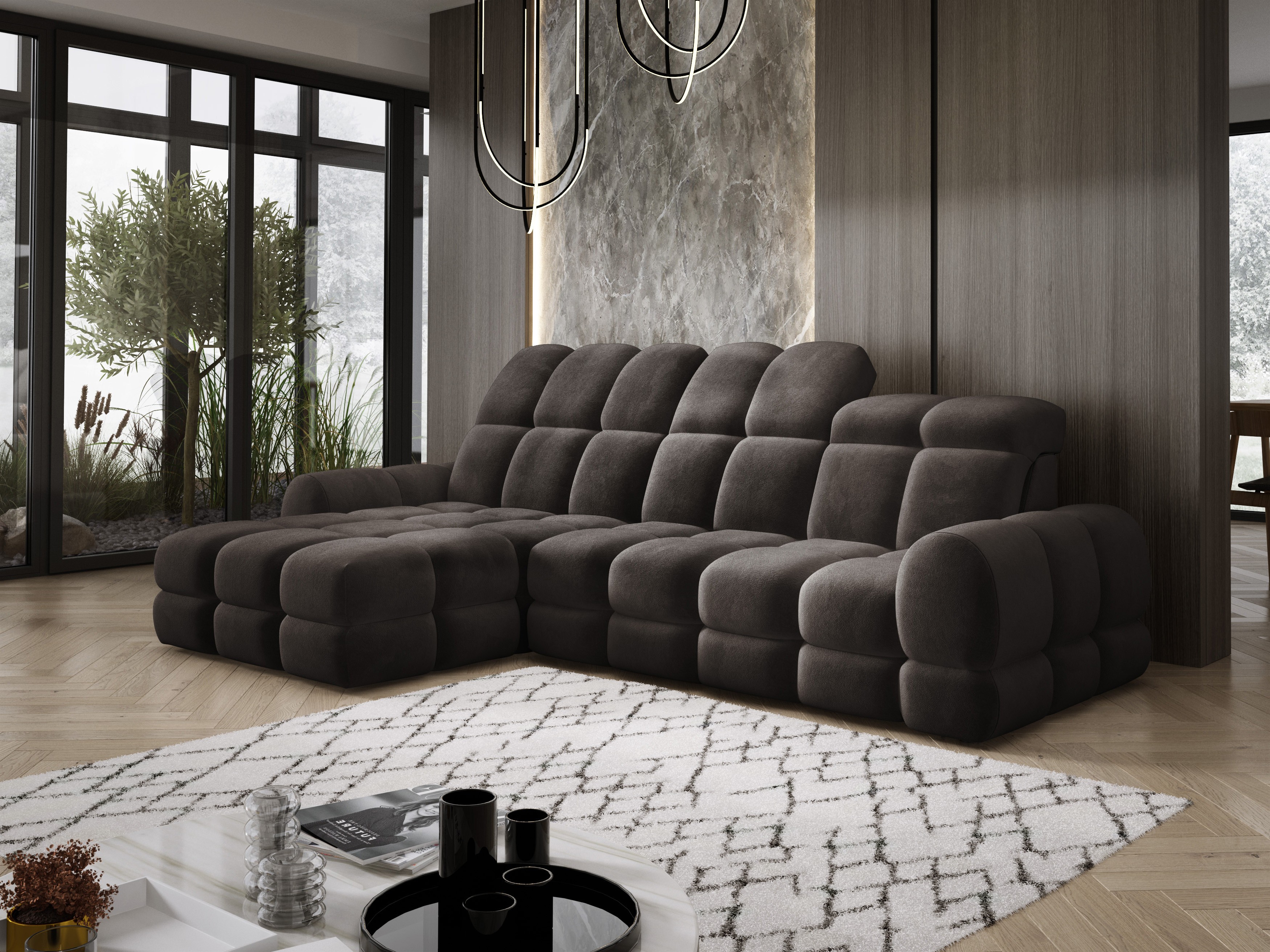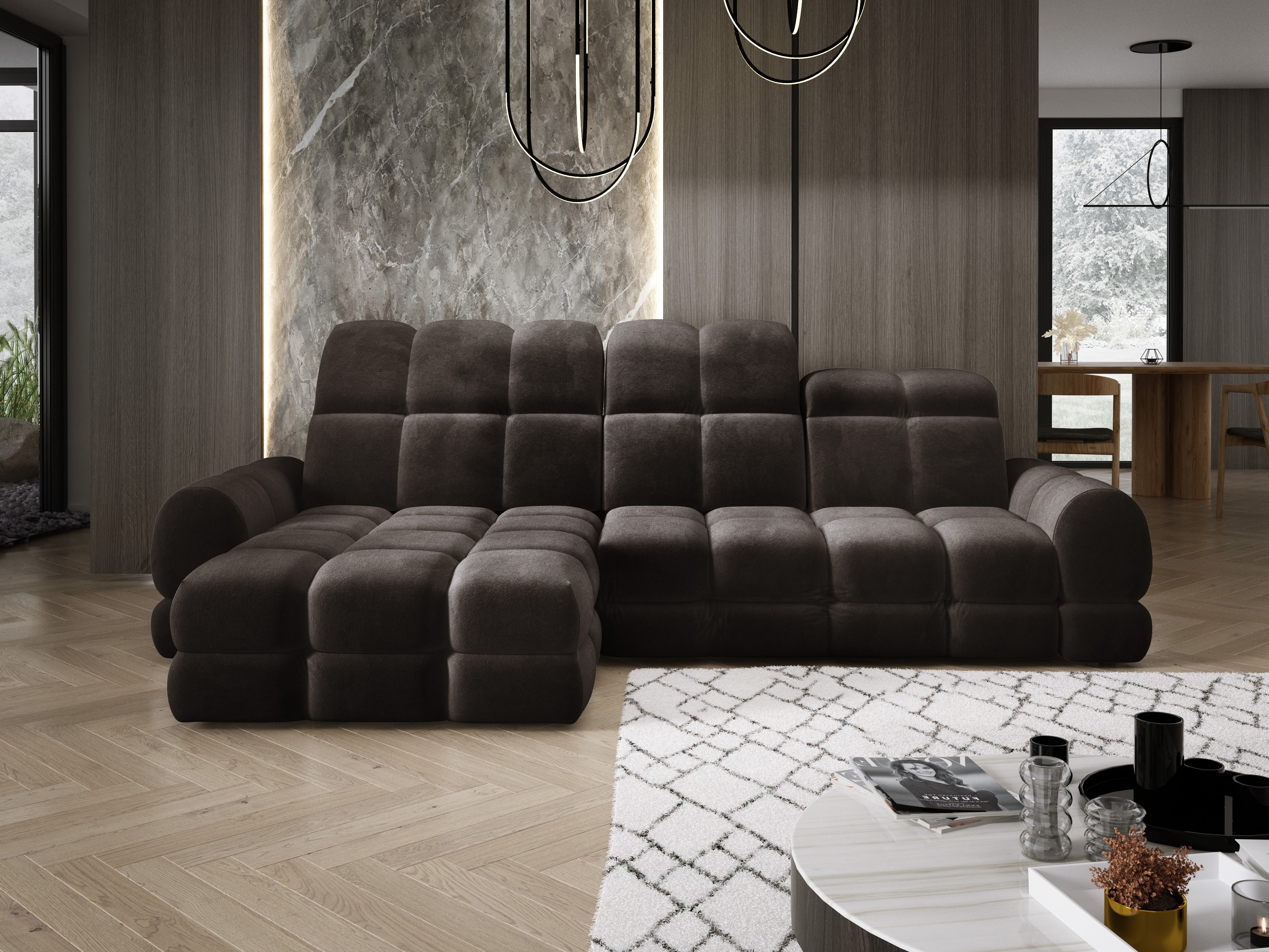 Model został wyposażony w elektrycznie rozkładaną funkcję spania, która w kilka chwil zamienia narożnik w komfortowe łóżko – idealne do codziennego relaksu lub dla gości.