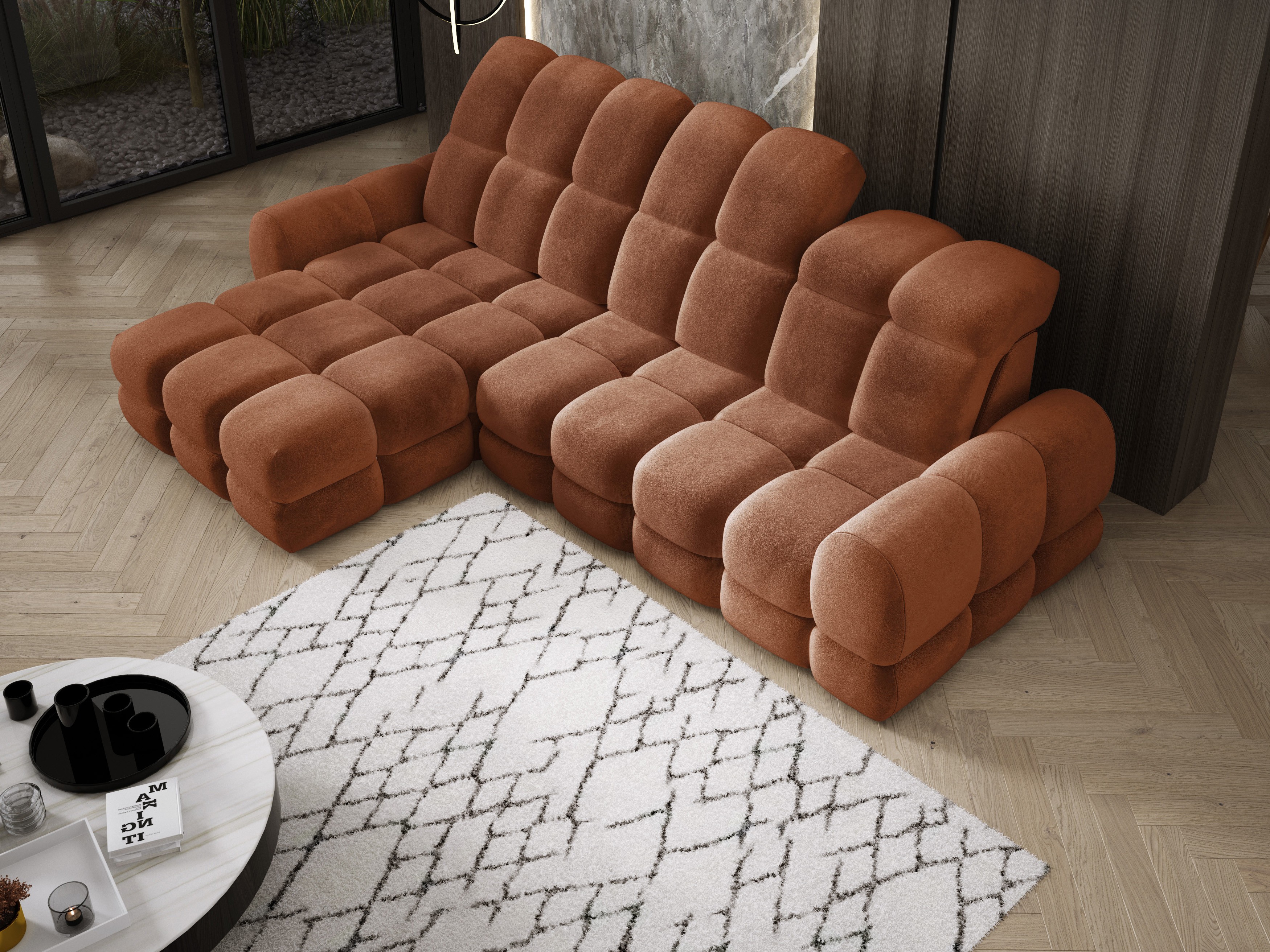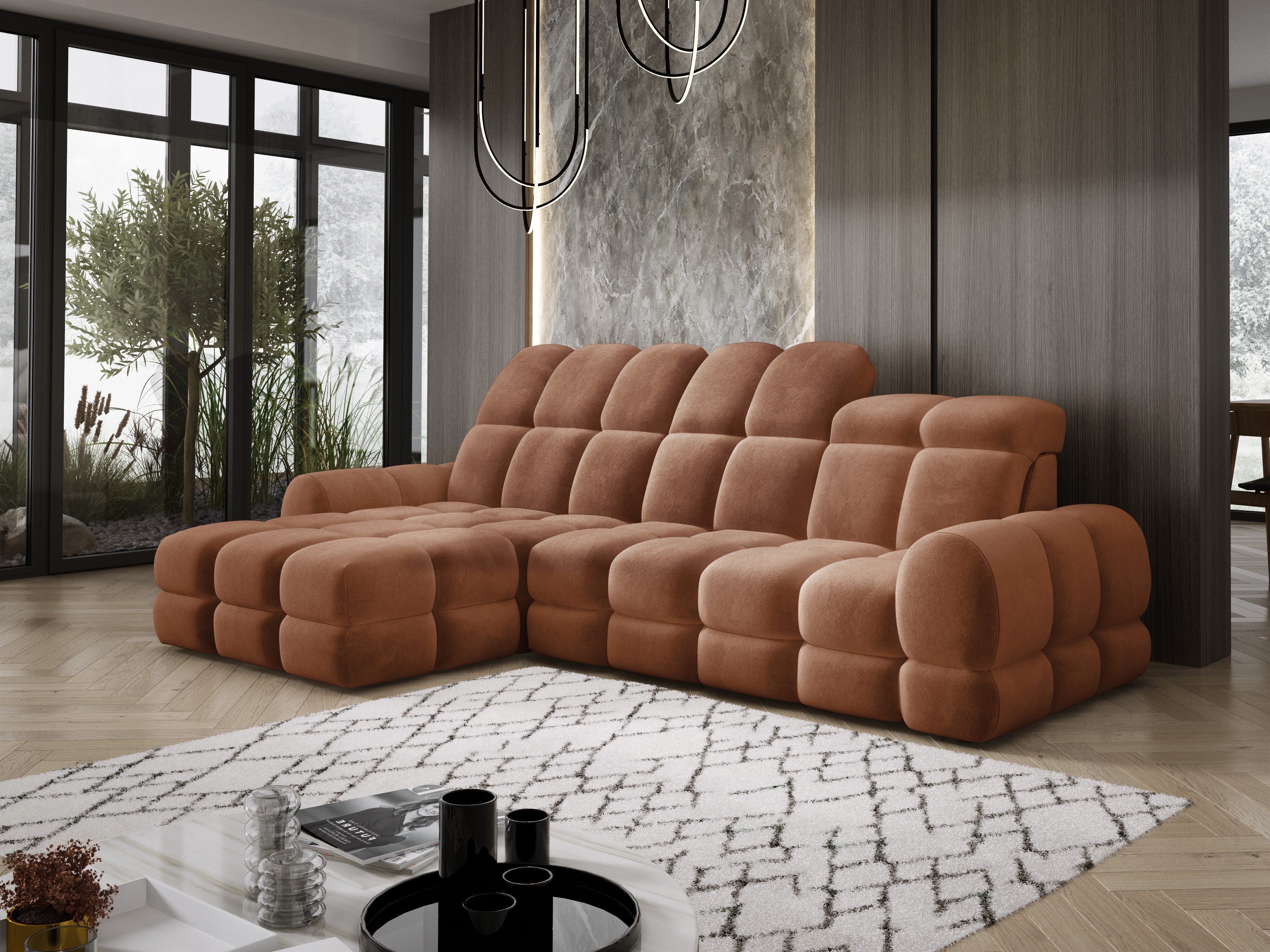Model został wyposażony w elektrycznie rozkładaną funkcję spania, która w kilka chwil zamienia narożnik w komfortowe łóżko – idealne do codziennego relaksu lub dla gości.